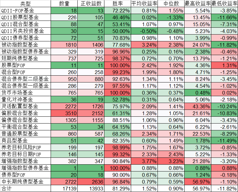 胜率超过98%的还有短期纯债型基金(737只,98.37%)、混合型FOF(260只、99.23%)、养老目标风险FOF(199只,98.99%)、养老目标日期FOF(145只,99.32%)等。FOF类型的胜率比较高,说明了有效的组合确实能降低风险。