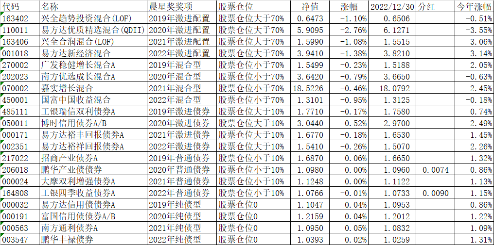 整体来说,激进债券、普通债券和纯债型基金的表现还算比较平稳,但权益类的激进配置和混合型中,4年的激进配置中,2019年获奖的兴全趋势(163402),今年净值已经下跌了0.51%,而2020年晨星奖的易方达优质精选(110011),今年已经亏损了3.55%了,2021、2022年的晨星奖,今年的净值增长率也只有3%多一点,并没有任何惊艳。