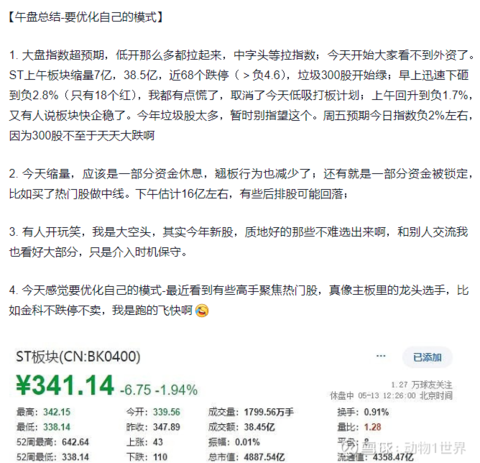 1. ST板块收盘负3.3%,近80个跌停(跌幅>-4.7%),放量7亿,今天新潮开板,9亿成交量,这种股太吸血了,周一能挣多少?考虑到个股大增,今天相当于以前板块跌4%,看看周一了,如果还>-2%,就表明恐慌延续;