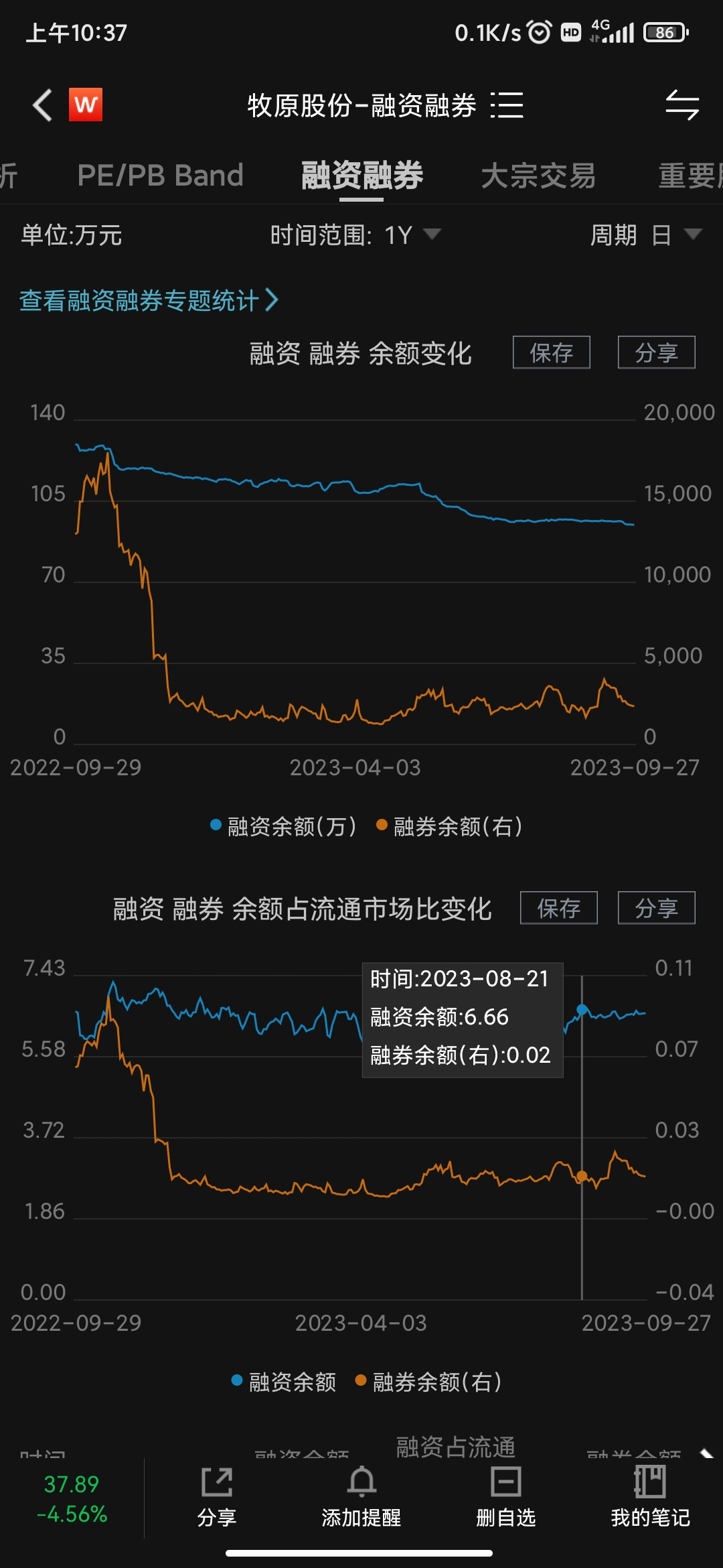 今天牧原正式击穿周期底本轮周期是一轮不一样的周期,三次探底了,按照以前的周期,每个猪价新底股价都会比前底高,但是现在是不停找新低6月9日说的话,为了避免大佬老师们来打自己的脸,只能自己翻出来先打,现在继续这个想法,每跌穿之前周期底38.14的5%,就要加5%仓位。第一加仓位36.23,离收盘的37.89还有4.4%,咬着手帕抹着泪期待中。。。话说怎么看股票的融资仓占比和持仓成本?Wind里面有专门的融资融券占比变化,至于具体的融资成本就需要进行估算了,另外我觉得昨天应该是外资撤离砸了近一亿,结合月底融资的没钱付利息被迫平仓的合力造成的砸盘
