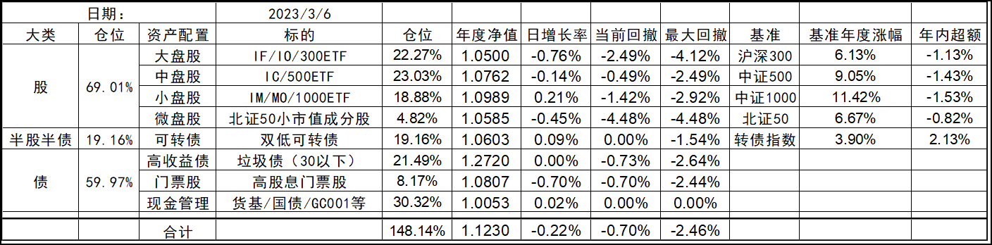 今年的持仓和去年底整体变化不大,重点只是记账方式发生了变化。指数的部分只是单纯用期指替代,然后每日记账时维持25%的保证金,同时增加了微盘股的北交所50成分股。整体依然是不择时、不深研选股的股债平衡的策略,虽在资产上重仓股票类(权益),但投研精力则放在债端的各种低风险策略上。权益类等效仓位最高不超过100%,固收类则不超过80%,杠杆率控制在130%~180%之间。