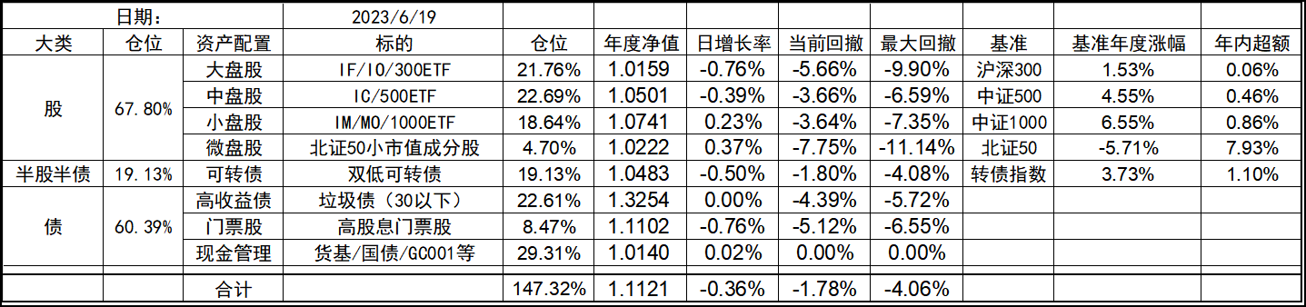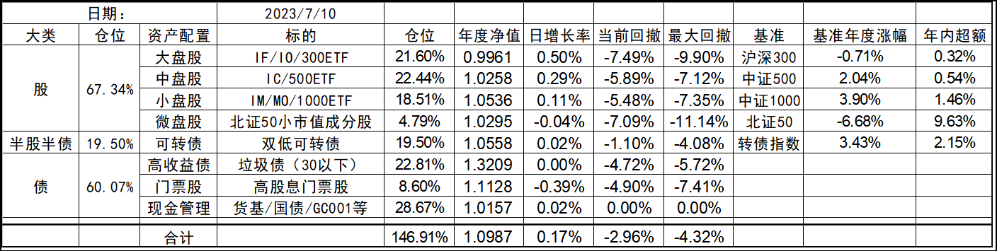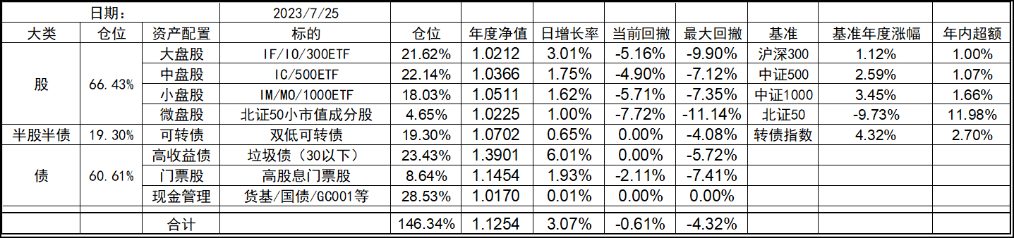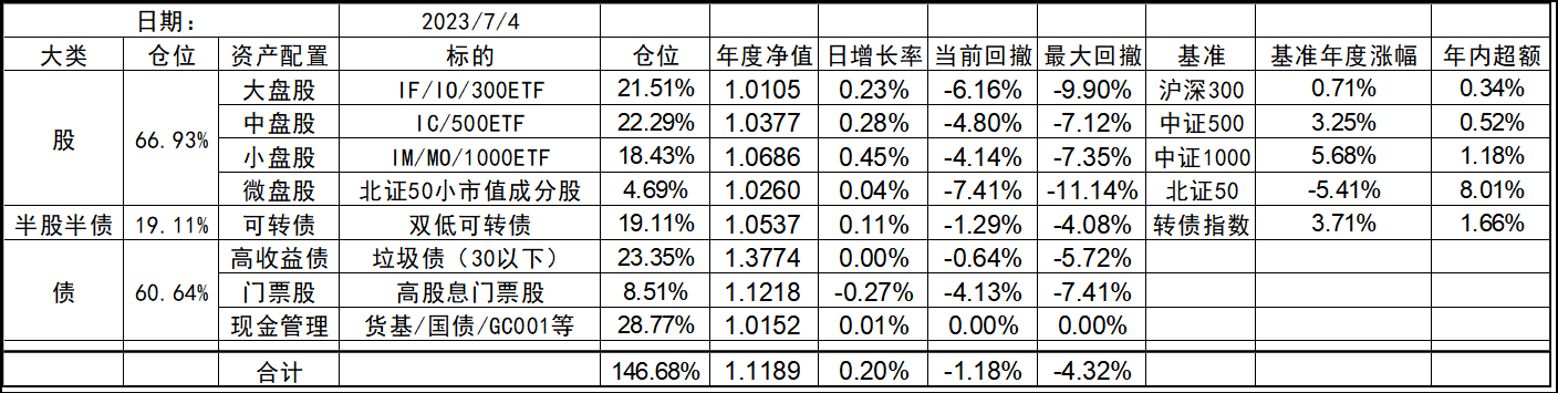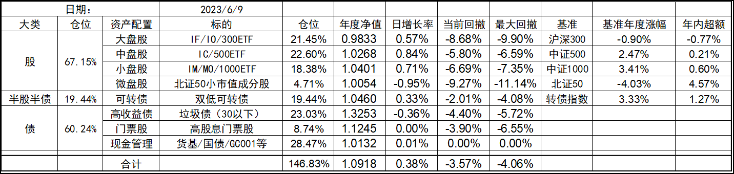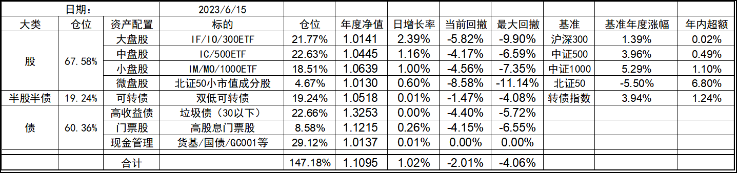 今年的持仓和去年底整体变化不大,重点只是记账方式发生了变化。指数的部分只是单纯用期指替代,然后每日记账时维持25%的保证金,同时增加了微盘股的北交所50成分股。整体依然是不择时、不深研选股的股债平衡的策略,虽在资产上重仓股票类(权益),但投研精力则放在债端的各种低风险策略上。权益类等效仓位最高不超过100%,固收类则不超过80%,杠杆率控制在130%~180%之间。