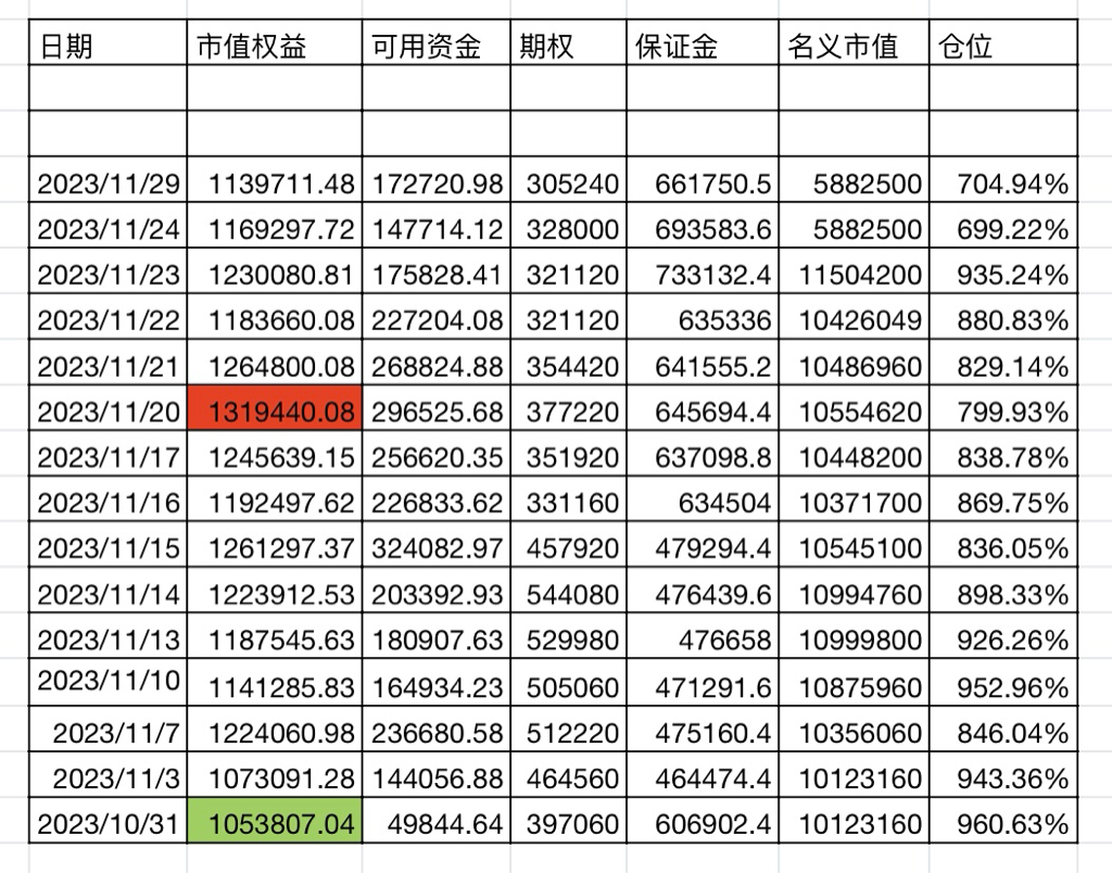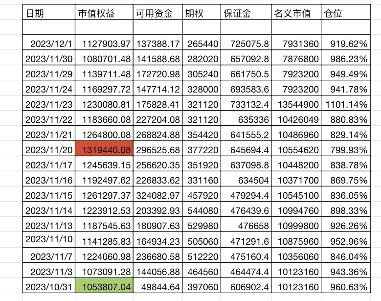 今天中证 1000 指数+1.05%,账户市值权益+8.28%,实际杠杆 7.89 倍。你这样算实际杠杆是不对的,要用“市值/资金”去算。