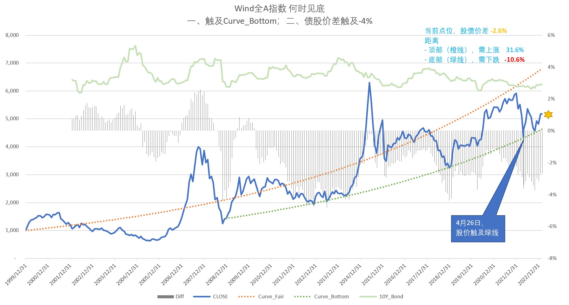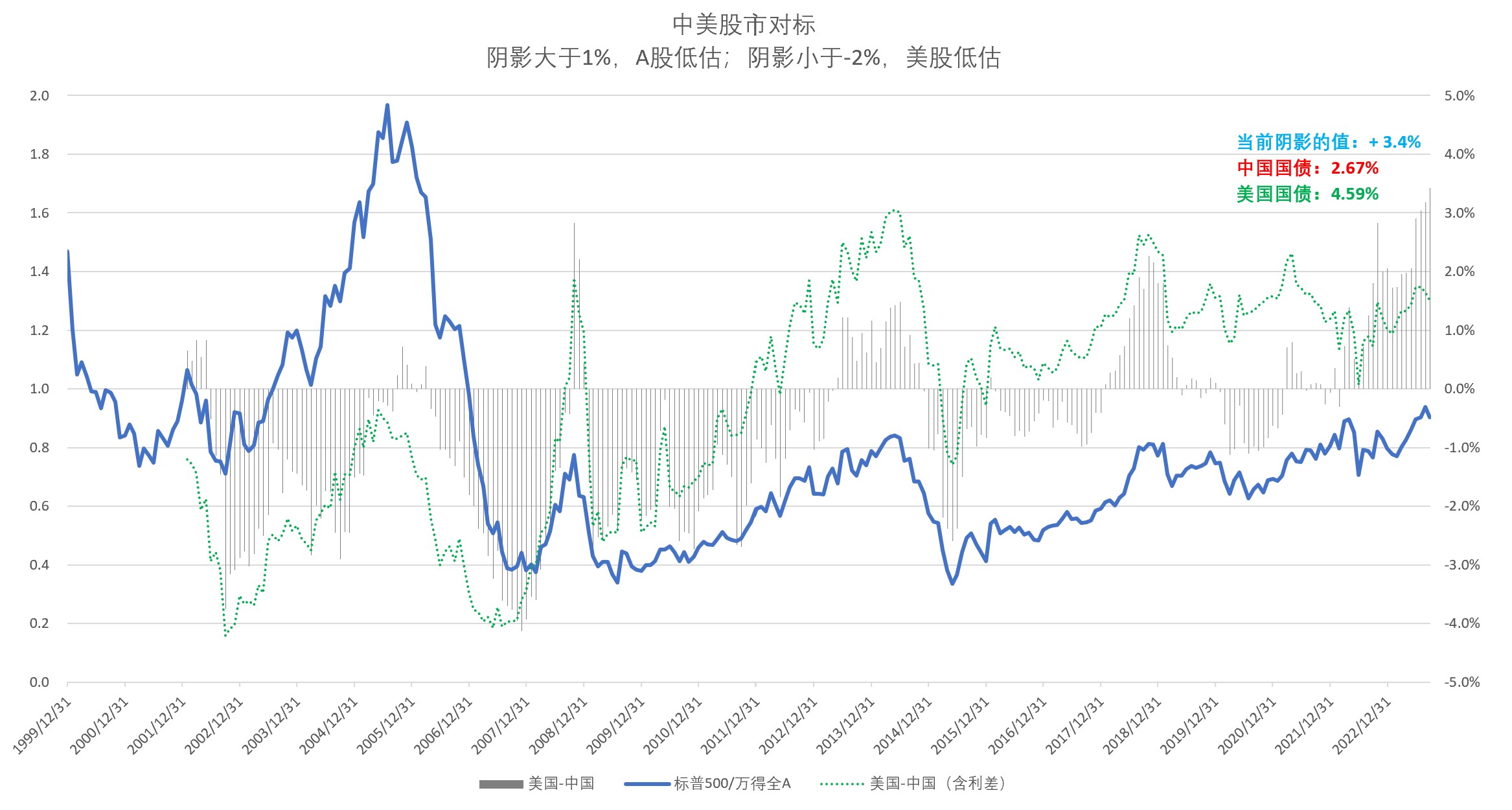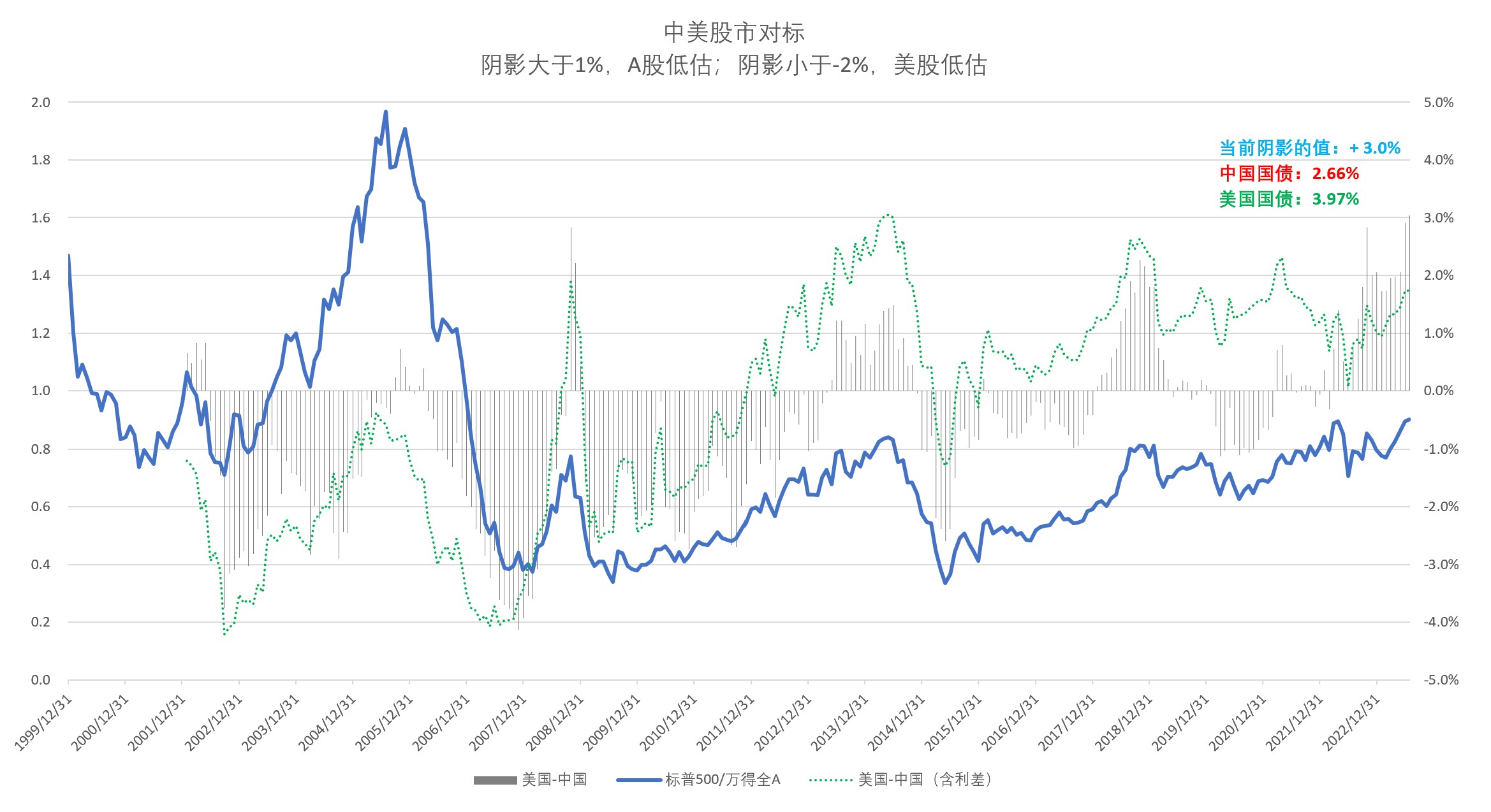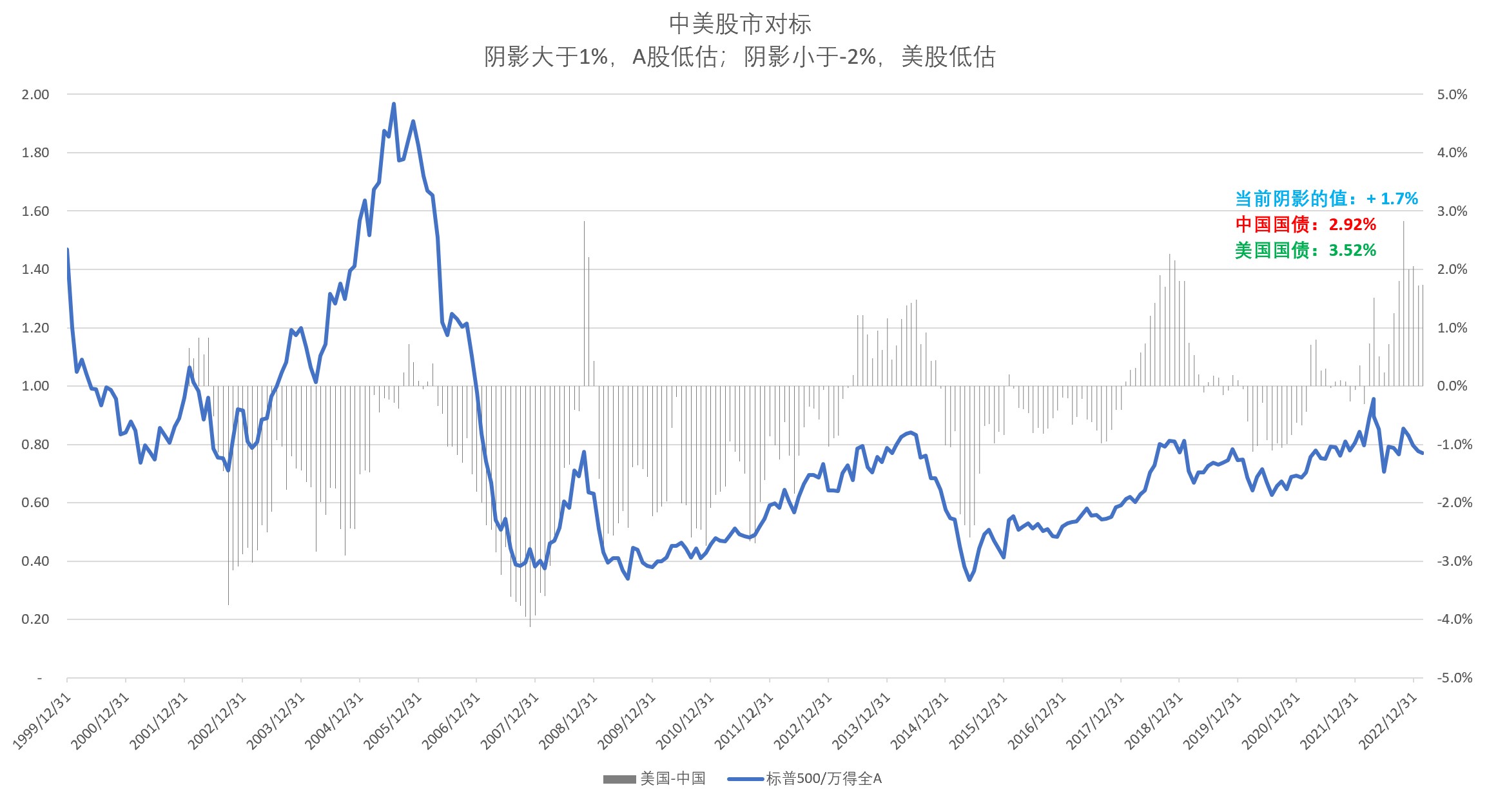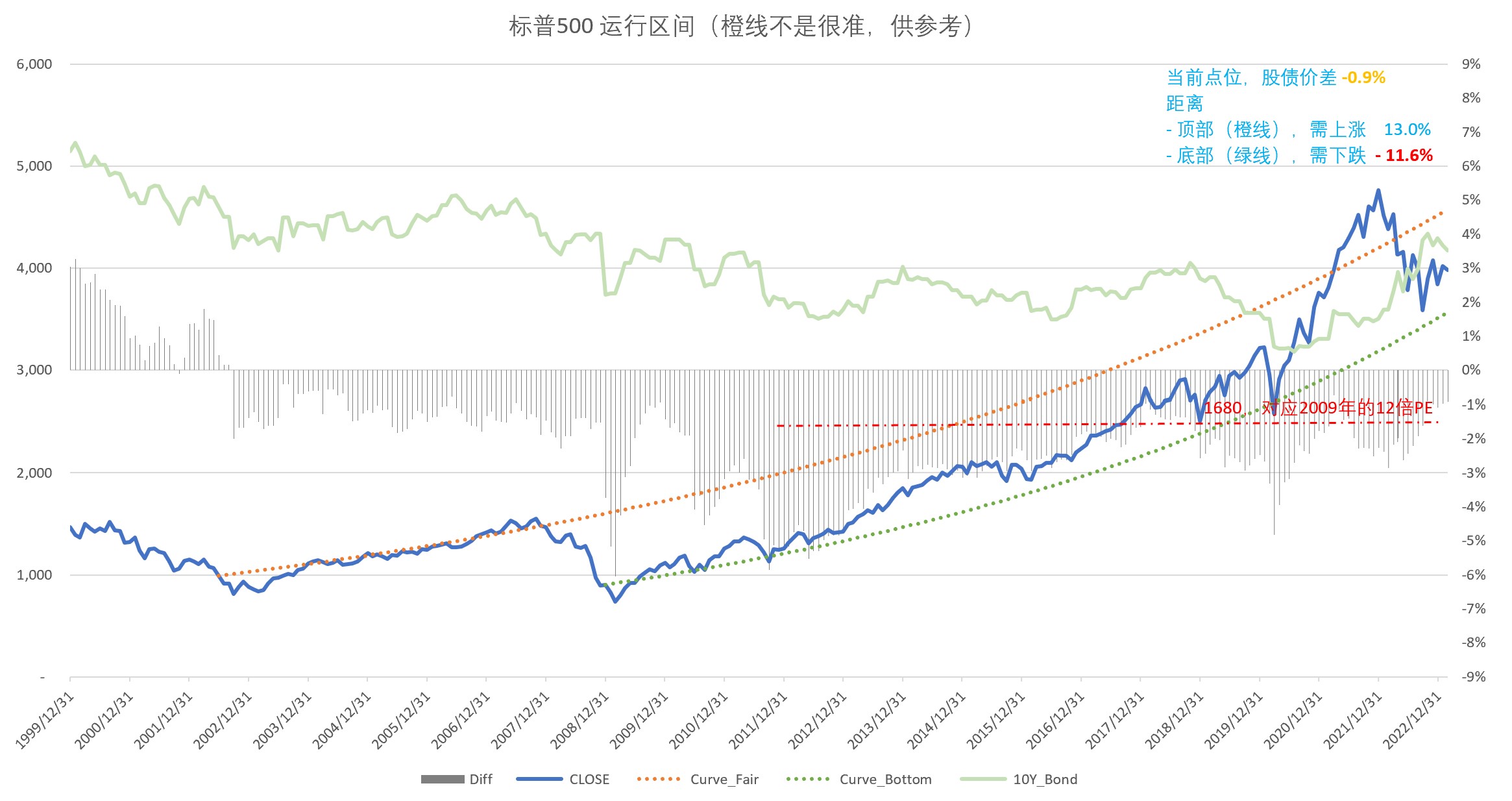 又称为“FED Model”,这个是非常经典的相对价值评估模型;从长期来看,无论是美国还是中国市场都是比较有效的;具体的解释,可以参见 《市场观察图表 —— 2022年(月度更新)》 的主帖,这里就不再赘述了。