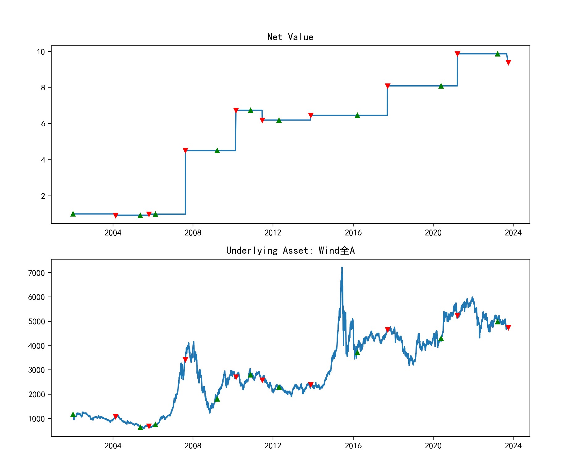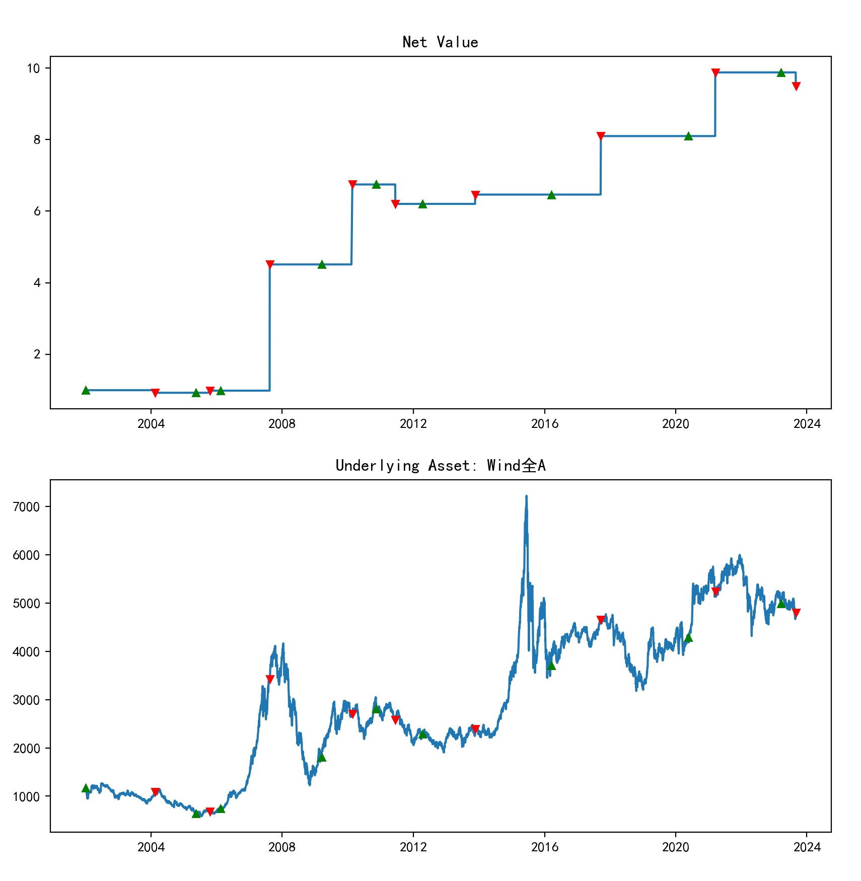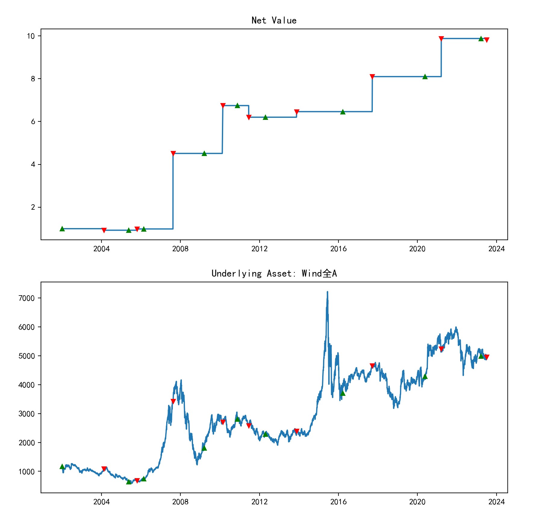 基于Feldman发表的《Buy and Hold Versus Timing Strategies: The Winner Is》,山寨了一个纯基于经济基本面的股市择时模型,并在全球多个国家的股市上进行了检测,总体看,用其做多股指的效果较佳;详情参见 《研究札记:择时策略对比》 的主帖,这里就不再赘述了。下图是在A股上则择时业绩回测: