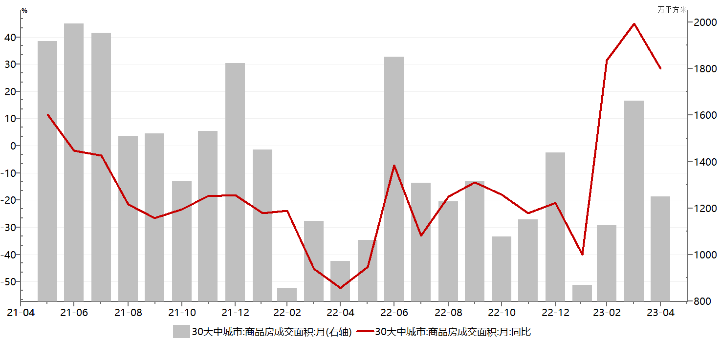 然而,房地产投资当月同比却由-5.7%回落至-5.9%。结合施工数据来看,本月竣工面积当月同比由8.0%大幅升至32.0%,新开工面积当月同比则由-9.4%回落至-29.0%,表明当前房地产投资的重点仍在保交付,房企新增投资的意愿不足。由于新开工面积增速再度回落,计入房地产投资的土地购置费增速预计也将下行。2023年3月,固定资产投资其他费用(包含土地购置)累计同比由16.9%降至8.2%,出现较大回落。可见,土地购置费用增速放缓或是本月房地产投资增速不佳的主要原因。