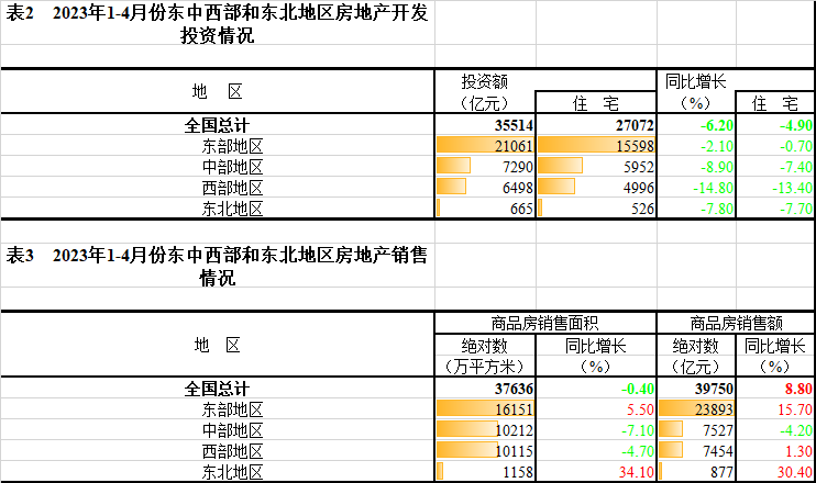 2023年1-4月份东中西部和东北地区房地产销售情况
