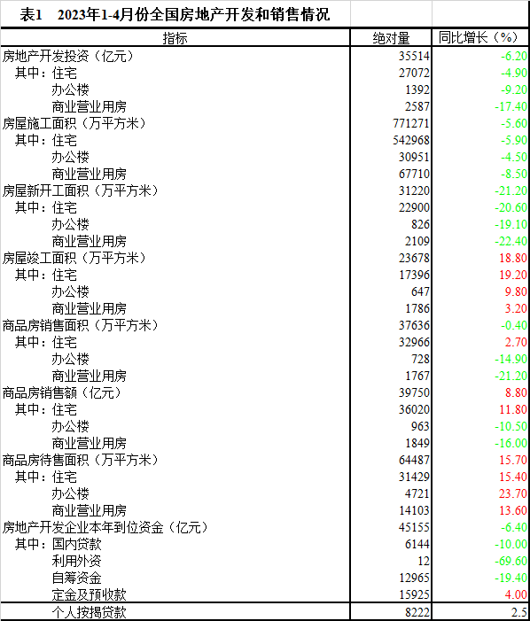 1—4月份,全国房地产开发投资35514亿元,同比下降6.2%(按可比口径计算,详见附注6);其中,住宅投资27072亿元,下降4.9%。