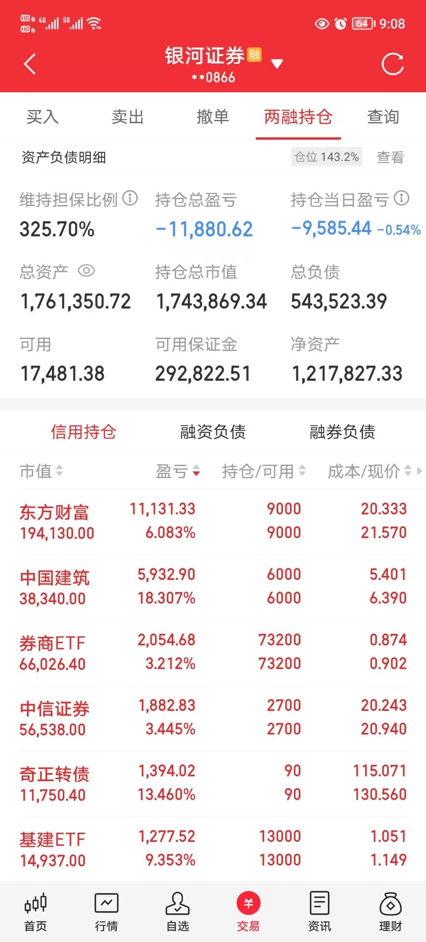 仓位156%,融资负债73.7万,现金可用3.8万元,融资可用13.3万元。