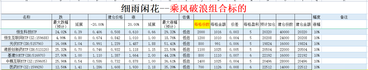 ETF:新能源ETF 恒生互联 券商ETF 医药ETF 恒生医疗ETF 中概互联 军工ETF 有色金属ETF 畜牧ETF 旅游ETF H股ETF 纳指ETF 光伏50ETF 创业板50ETF 科创50ETF 1000ETF 芯片ETF 消费ETF 酒ETF 300ETF 500ETF 标普500ETF 黄金ETF 煤炭ETF 基建ETF,特点是不会死,下跌敢加仓,0.5%一格,每格1000元,一格赚5元。