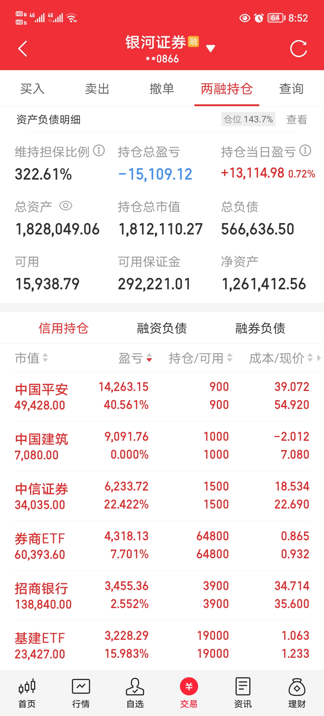 仓位156.3%,融资负债72万,现金可用1.8万元,融资可用14.4万元。