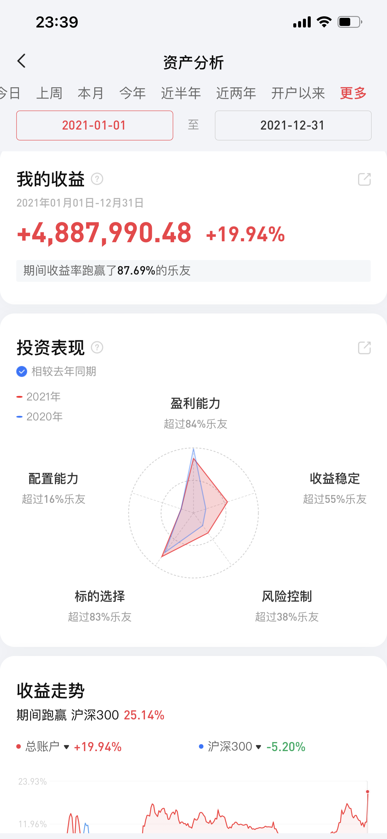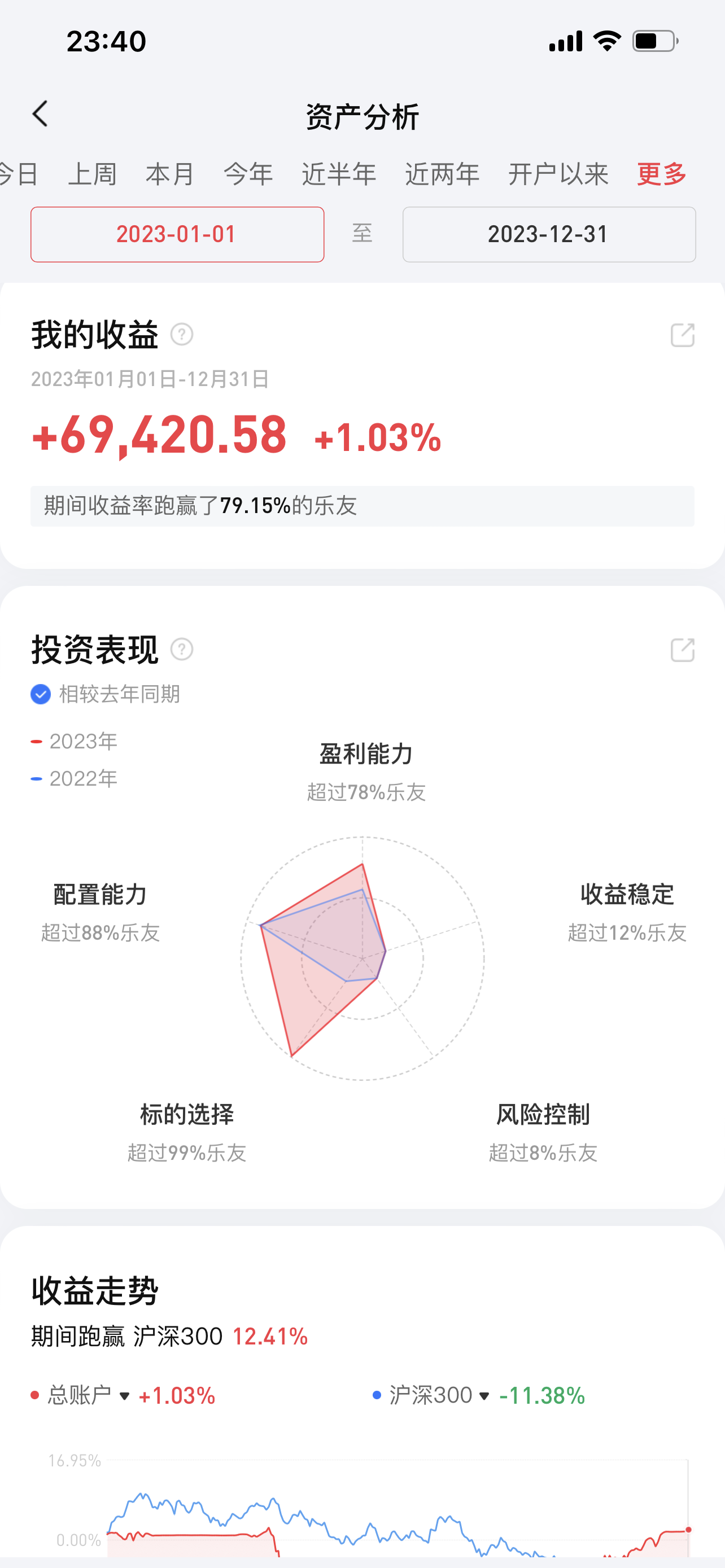 所以我在2021年10月转入防守,2022年,2023年在两年指数大跌的情况下,很稳健的拿下22%,15%的收益。