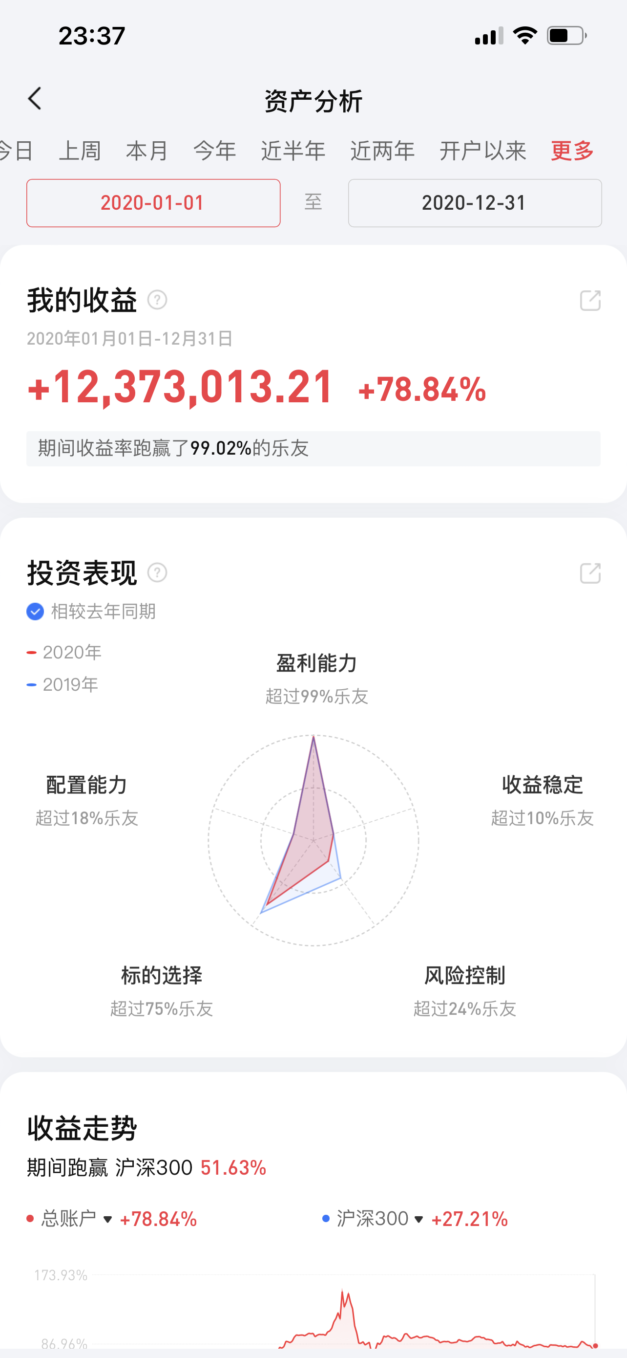 晒业绩谁不会啊,都是靠运气赚的钱,后面还不是泯然众人焉,网上炫耀业绩的,以前都是想拉人代客理财,现在都是想开私募,自己能不能赚钱没有把握,赚别人的管理费倒是把握大得很,就算不收管理费,靠别人的钱做个免费杠杆也是好事,跌了无所谓,赚了提取20%业绩提成,美滋滋。大家千万别信这些人,一个个吹得天花乱坠,等你买了之后,以前说的什么低风险套利稳定赚钱,XXX轮动无惧牛熊,阿尔法贝塔洋话连篇,全都是骗人上车...我个人的FOF研究经验非常浅薄,但依然可以很明确地说,你晒的这个不知道谁的业绩,作为个人投资者或许是值得称道的。但如果是作为私募,是毫无吸引力的。