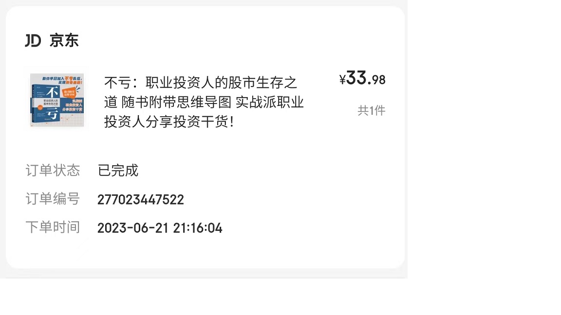 如果你是尚未稳定盈利的投资老手,那么《不亏》不会给您带来震撼感,因为依然是老生常谈,但书是作者对思想和认知系统性的阐述,有别写帖子。以我的认知投资的成长不是不知道,而是知道到深刻理解到做到的过程。