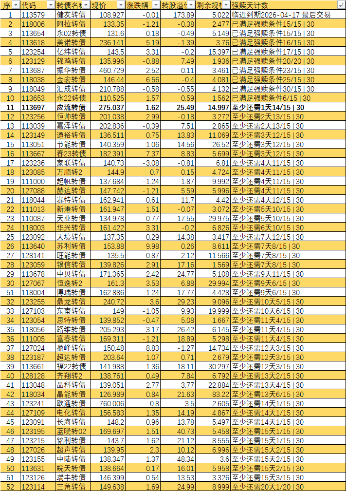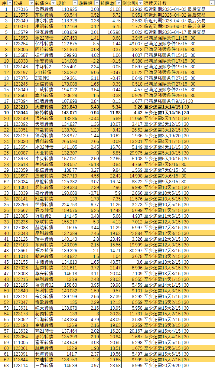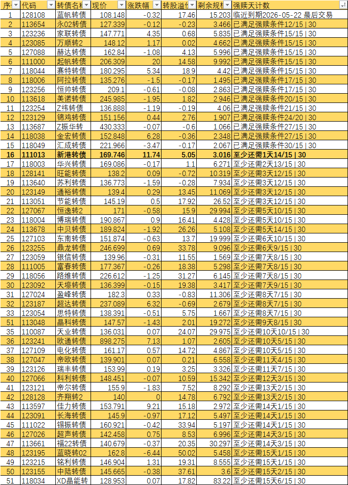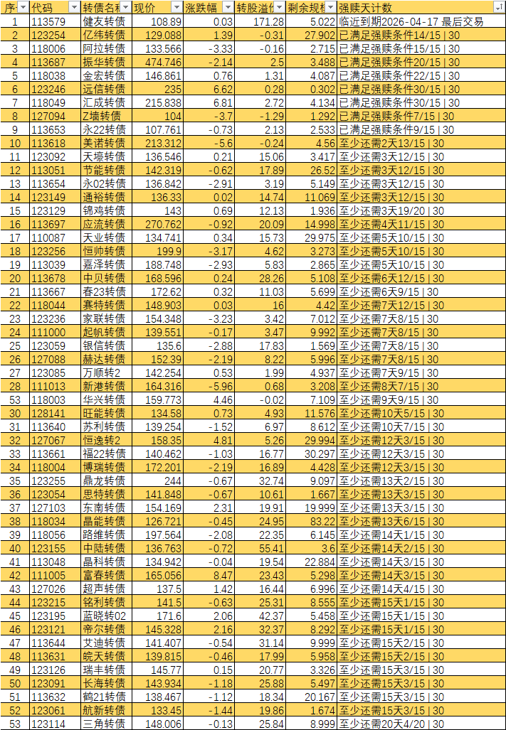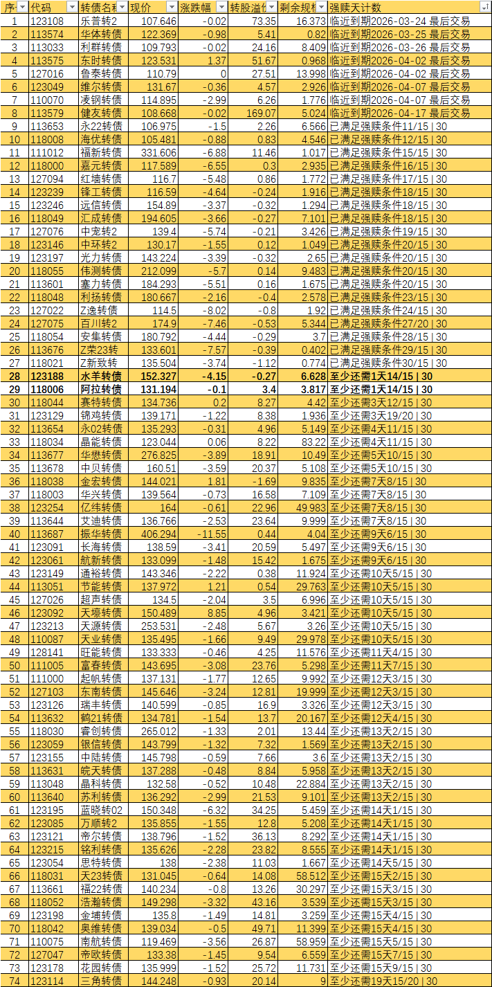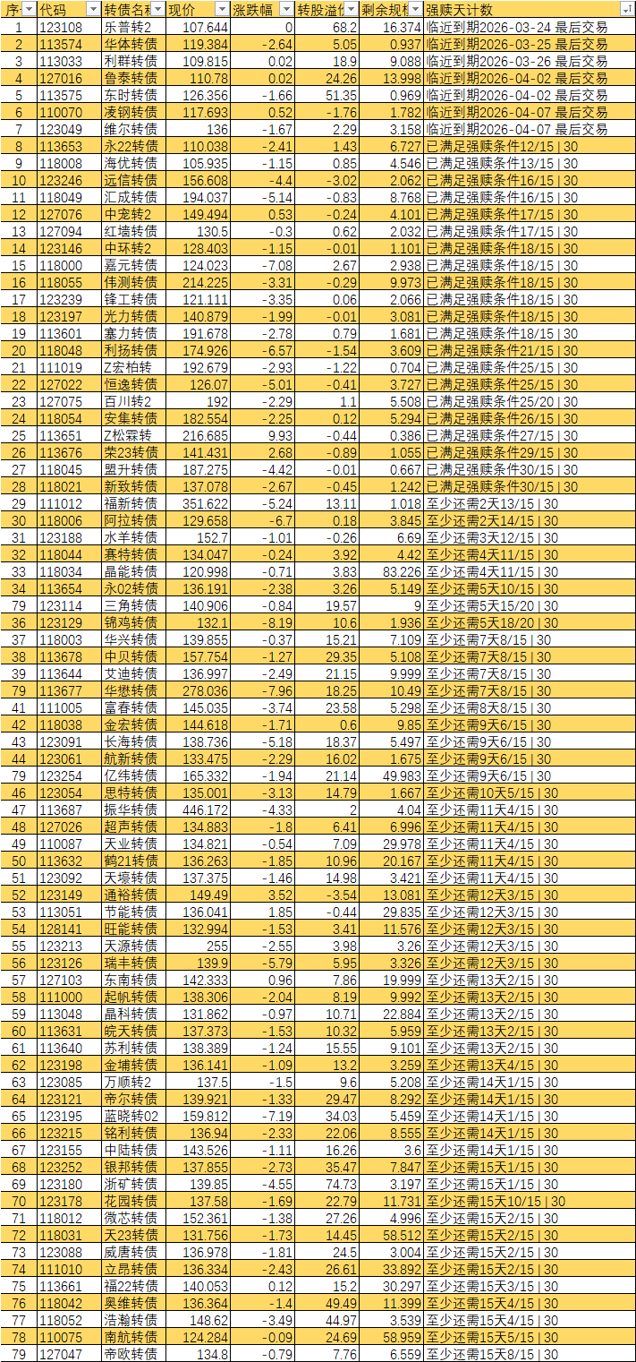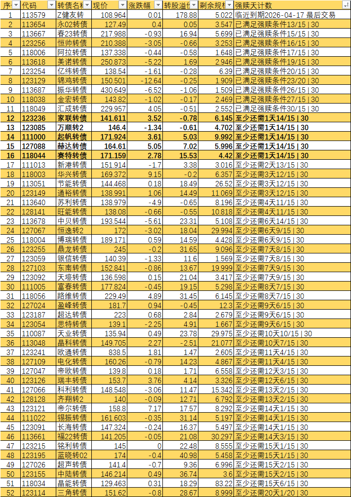 根据现有数据,截至3月10日有10个交易日达标,加上3月11日至16日的4个交易日,目前总共只有14个交易日满足强赎条件,尚未达到触发强赎所需的15天。