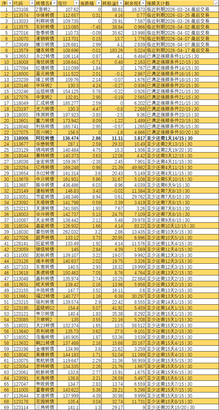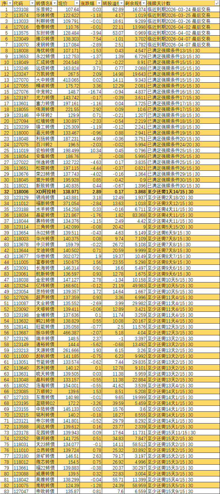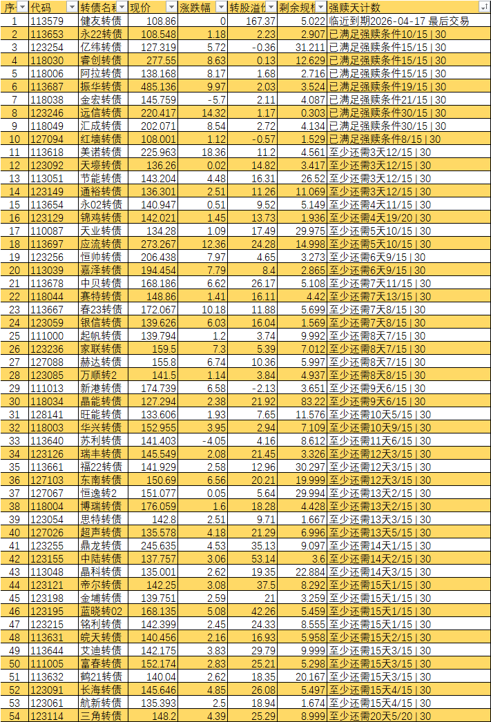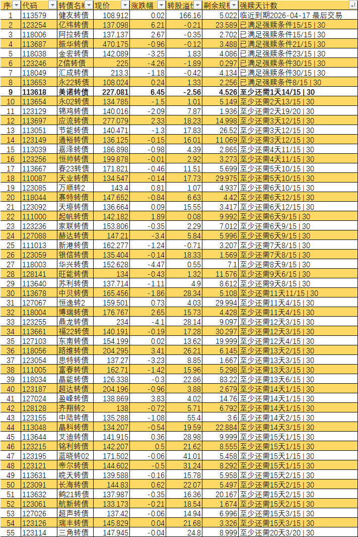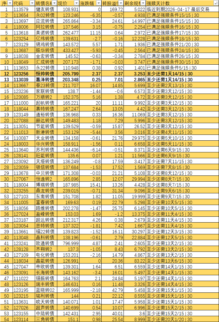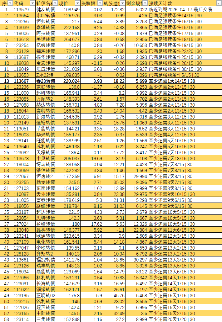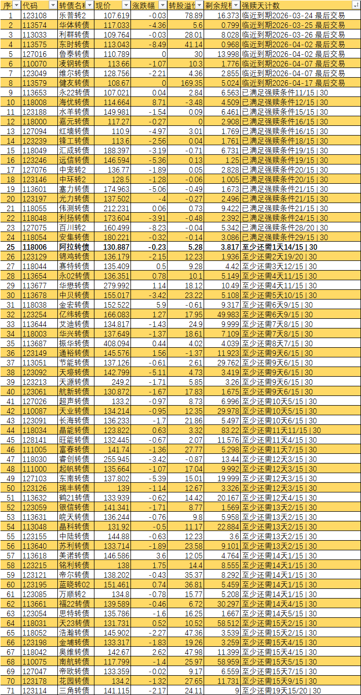 根据现有数据,截至3月10日有10个交易日达标,加上3月11日至16日的4个交易日,目前总共只有14个交易日满足强赎条件,尚未达到触发强赎所需的15天。