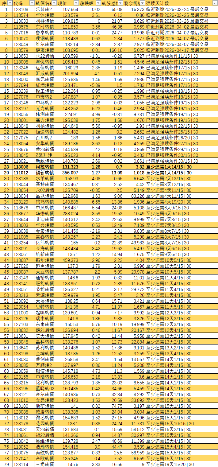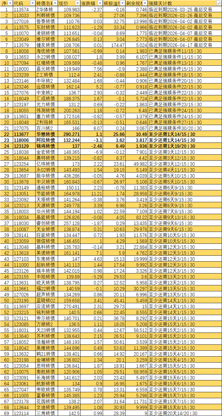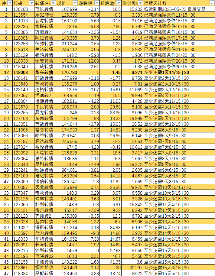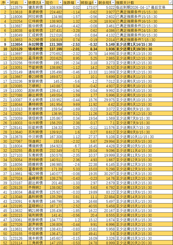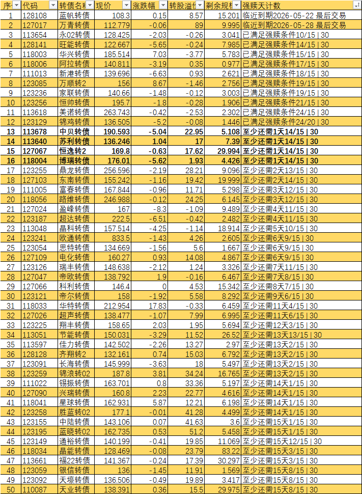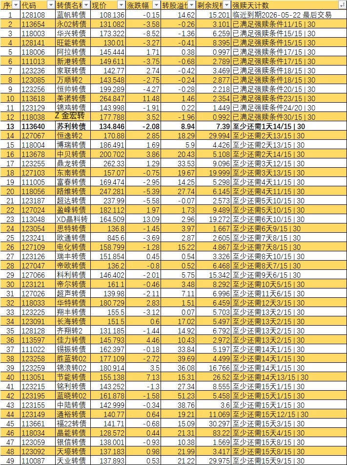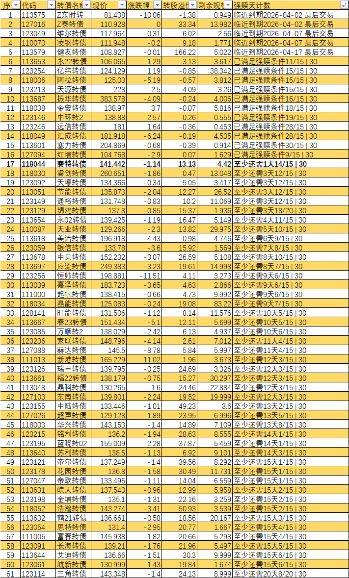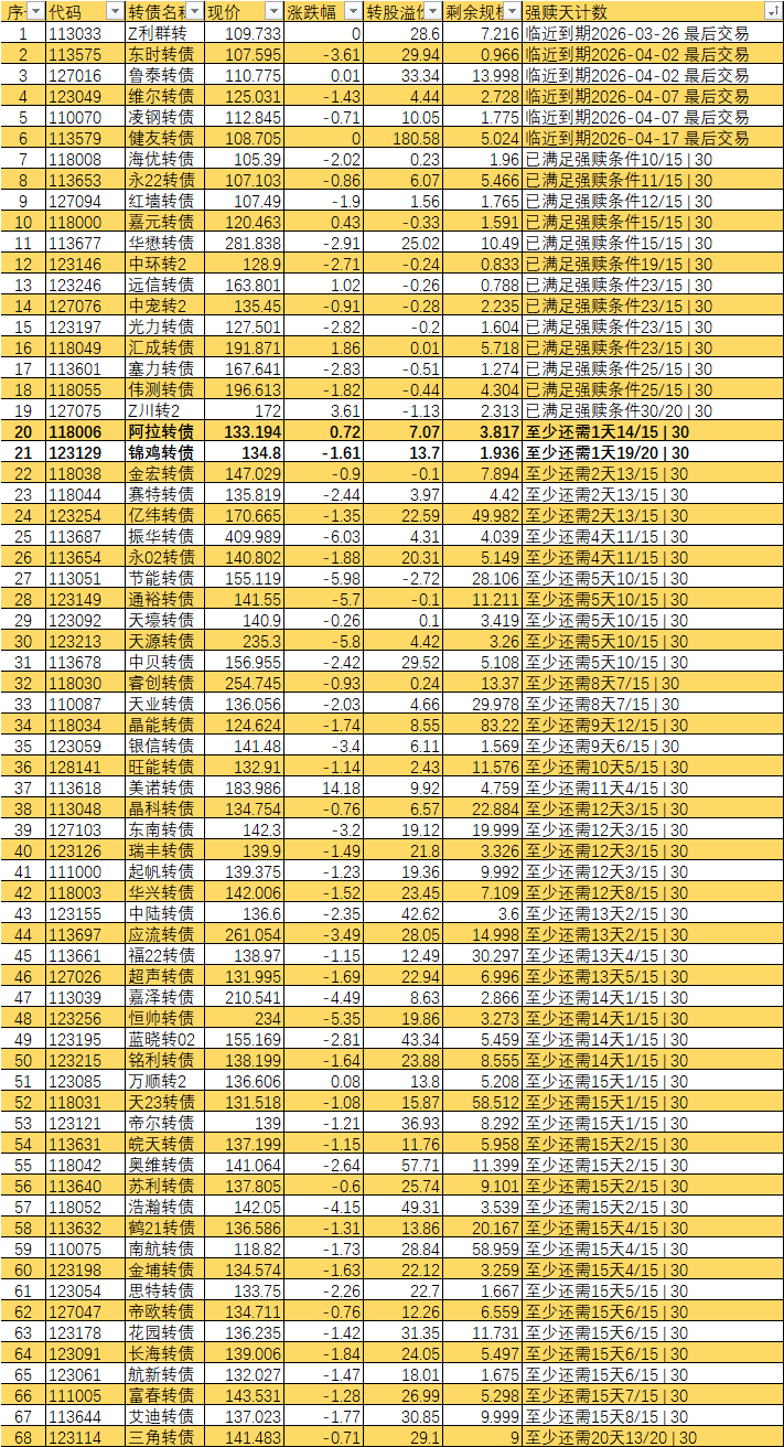 根据现有数据,截至3月10日有10个交易日达标,加上3月11日至16日的4个交易日,目前总共只有14个交易日满足强赎条件,尚未达到触发强赎所需的15天。