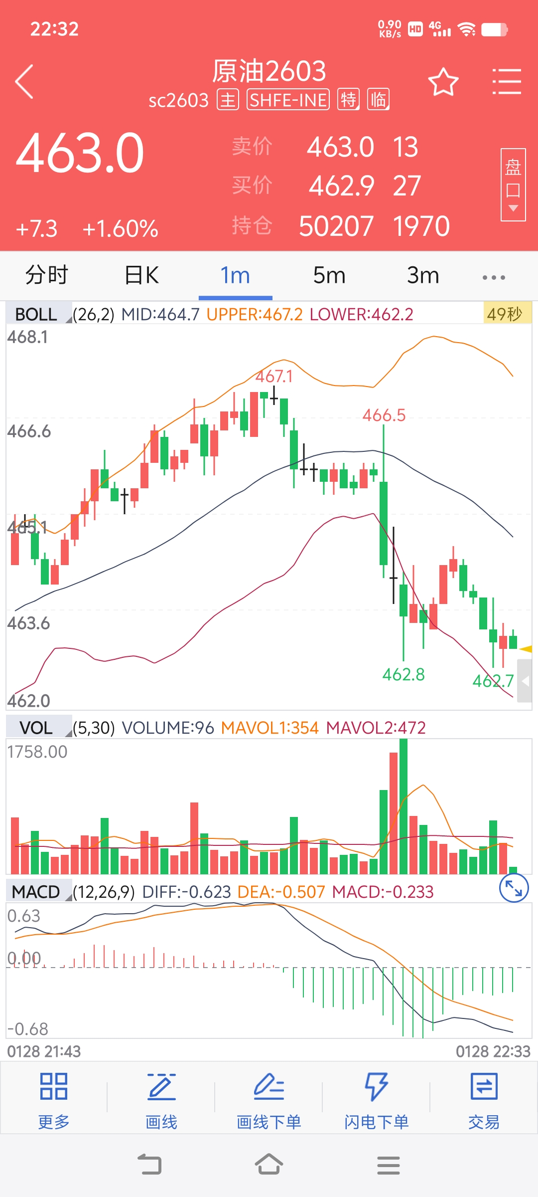 待到10点时候看着上证50一分钟有突破形态赶紧46.6元挂单买了进去,后面用50%画线跟踪挂51元走的。
