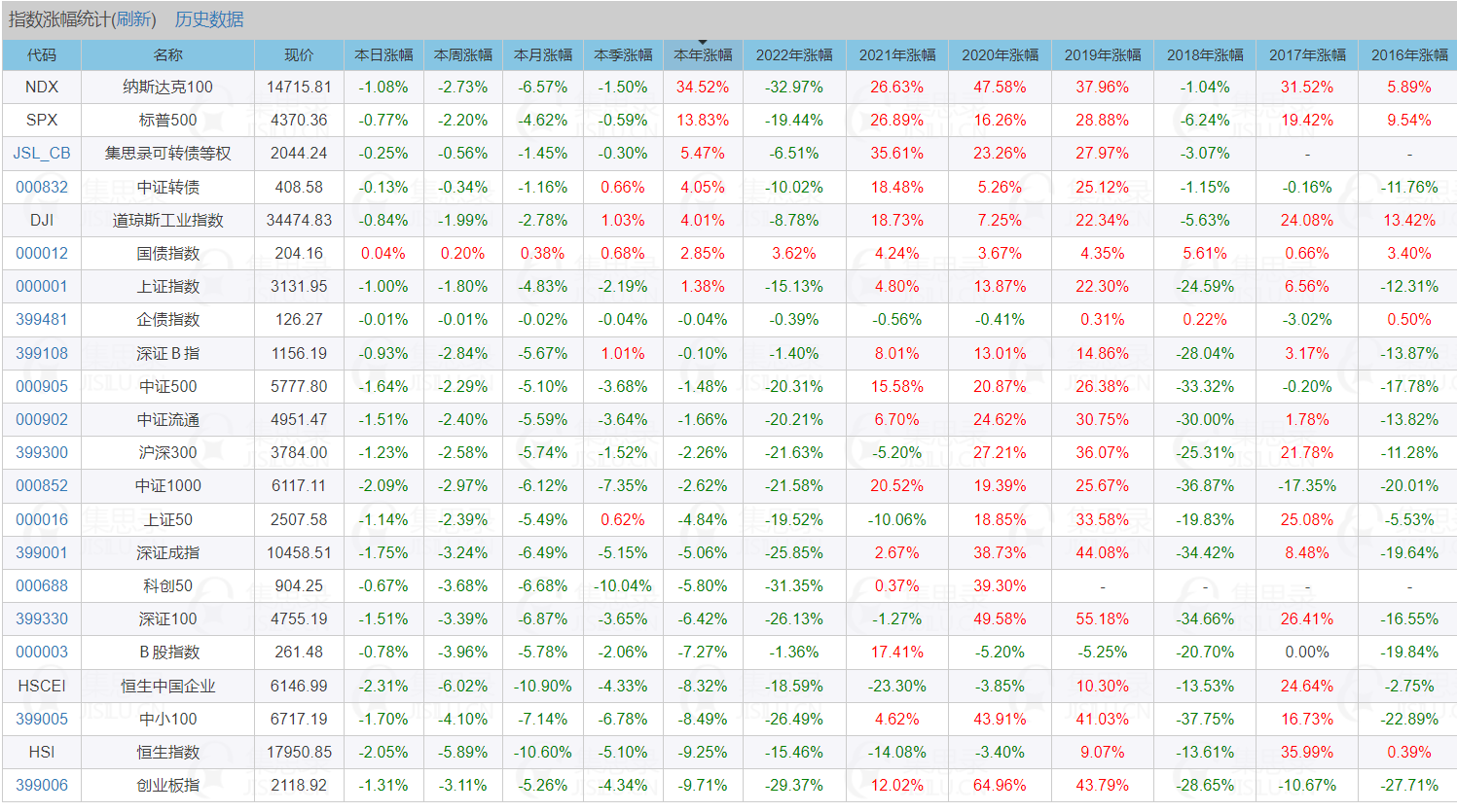 指数涨幅页面里现在是各指数每年涨跌幅单列