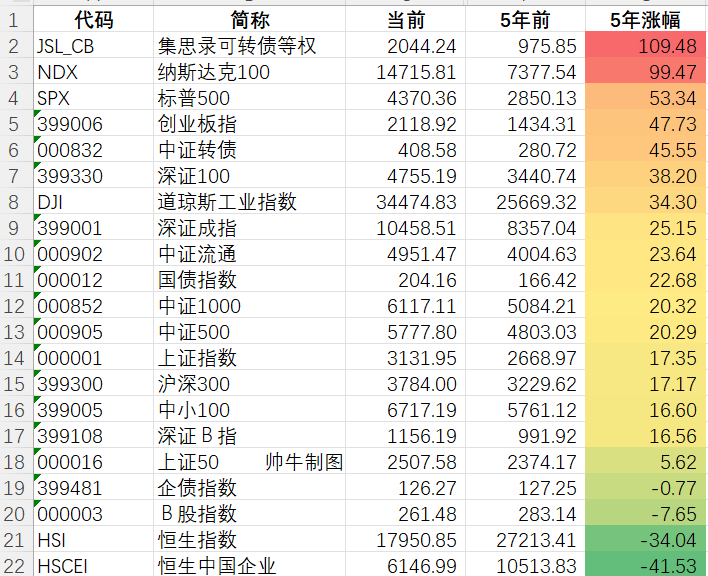 投资还是要看长期,就总结了一下过去5年各指数总回报
