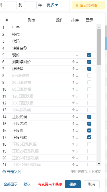 可转债自定义列表,手动自定义完成后,能否增加保存定制方案的功能,因为网页过了一段时间,就自动恢复到默认的列表了,又要重新手动调整,比较麻烦。