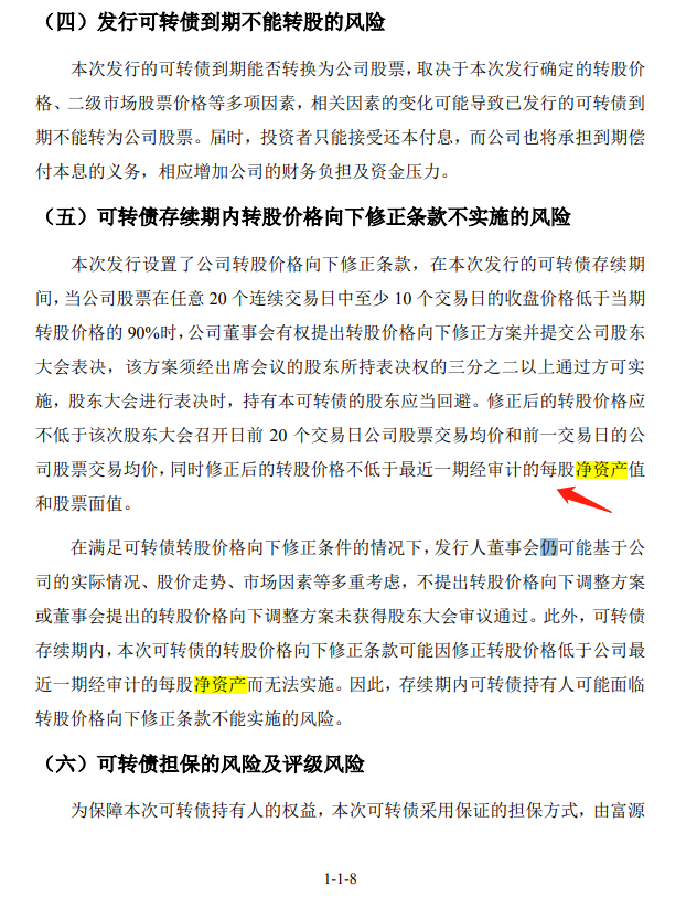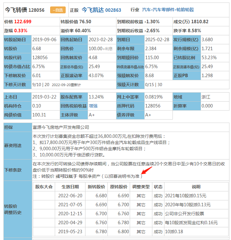 今飞转债(128056)下修条款有误。感谢您的反馈。查了一下相关的文件,能否低于净资产的约束条款通常都出现“转股价格的确定及其调整”这个章节里,今飞在转股价这个章节里并没有提到“同时修正后的转股价格不低于最近一期经审计的每股净资产和股票面值。”而是像您截图的在风险提示里,感觉可以联系公司确认一下。