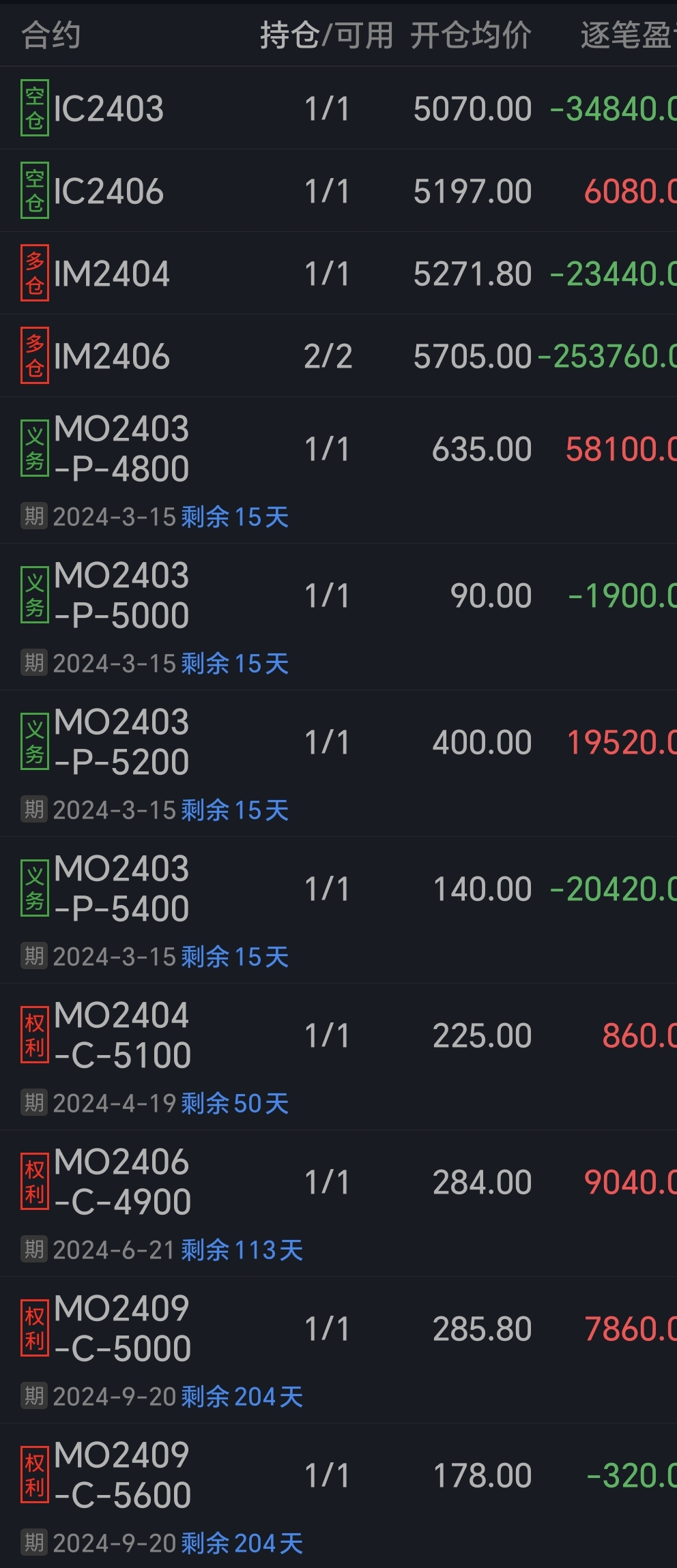另外,今天完成了全部期权换月,(IM之前在贴水比较低的时候就“自动”换了),这个月大致吃到贴水+时间价值4万左右。如能保持每月这么多,指数不用涨,今年也可以不亏了~~