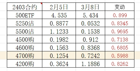 讲了N遍了,换买购买最深实!换买购买最深实!换买购买最深实!手数不变不代表DELTA不变!换的那个合约DELTA绝对值不能比原来那个小啊,换小了肯定亏了啊!方案二不如方案一,就是因为4700DELTA小于4500啊!2月5日明明有4200购,为什么要买4500和4700?最基本的教科书知识。我是没复盘,但直觉就觉得4200结果最好。4200方案:0.8877+0.3624=1.2501元,3月8...如果是现在复盘。那么2月5号最好的方式肯定是卖深实值沽。