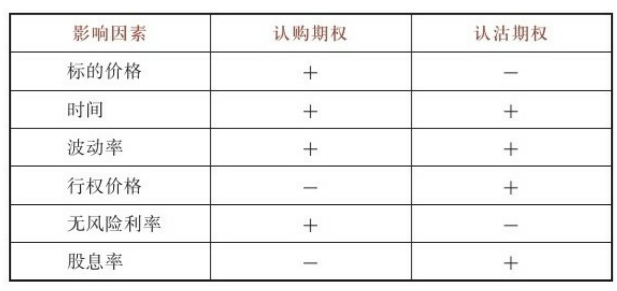 期权价格(权利金)由由两部分构成,一部分就是内在价值,也就是买方立刻行权获得的收入,=现价-行权价,另一部分则是时间价值,期权价格-内在价值。影响期权的主要影响因素:标的价格、波动率、时间、行权价格、无风险利率和股息率。