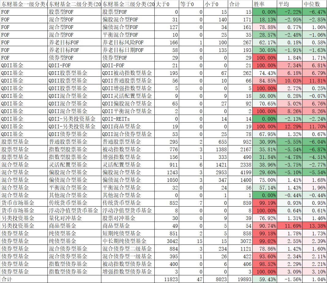 当然,作为大类来说,胜率最高的肯定是货币型基金,859只货币型基金中无一亏损,但平均收益率才0.93%,中位数也只有0.95%。