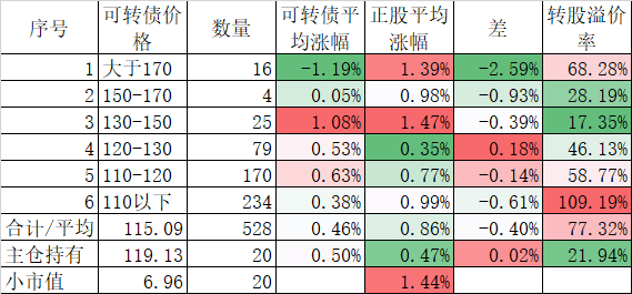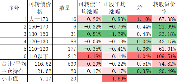 531只可转债平均上涨0.48%,对应正股平均上涨0.90%;我的主仓20只可转债平均上涨0.12%,对应正股平均上涨0.00%。账户实际合计上涨0.15%。前几天跑赢可转债等权指数后今天又跑输了。