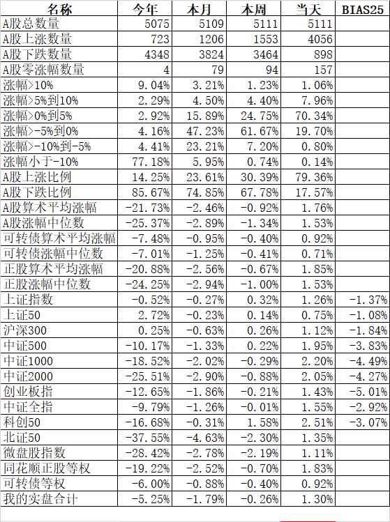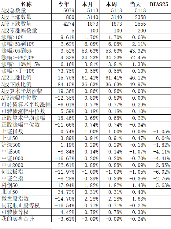 2358只个股上涨、2555只个股下跌,涨幅中位数正好为零。