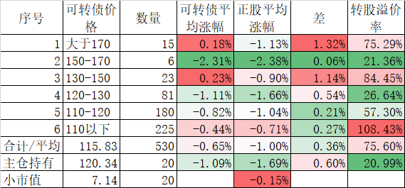 530只可转债平均下跌0.65%,对应正股平均下跌1.00%。我的主仓20只可转债平均下跌1.09%,对应正股平均下跌1.69%。账户实际也是下跌了1.09%。
