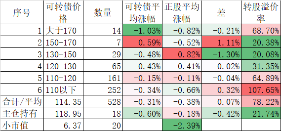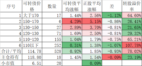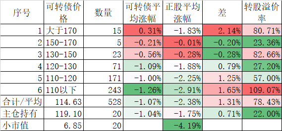 528只可转债平均下跌1.07%,对应正股平均下跌2.38%。我的主仓20只可转债平均下跌1.04%,对应正股平均下跌1.75%。账户合计实际下跌了0.83%。