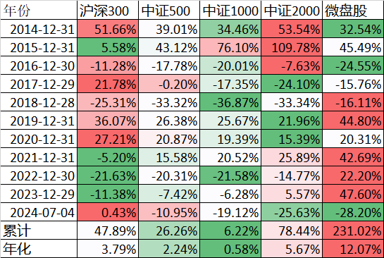 我们来看看从沪深300指数到微盘股指数这5只规模指数在最近10年里的涨跌变化: