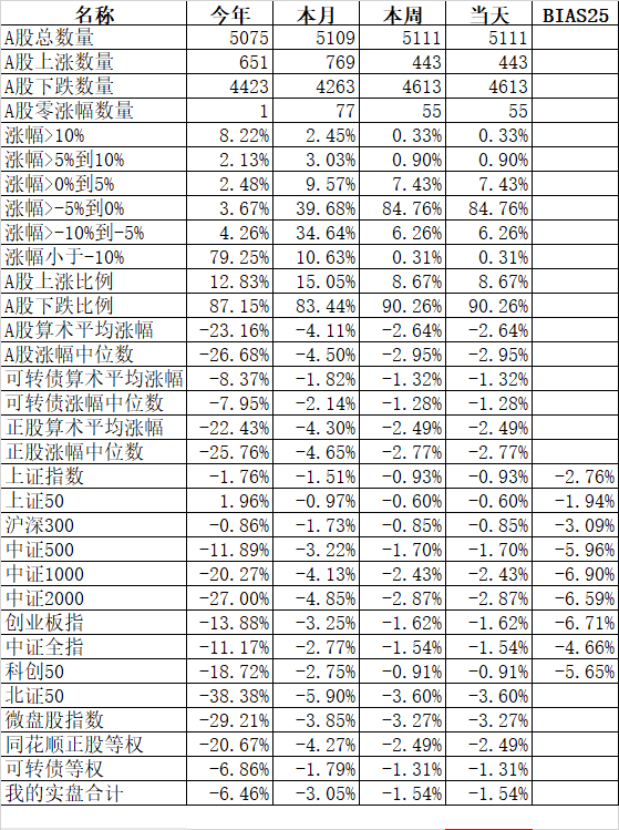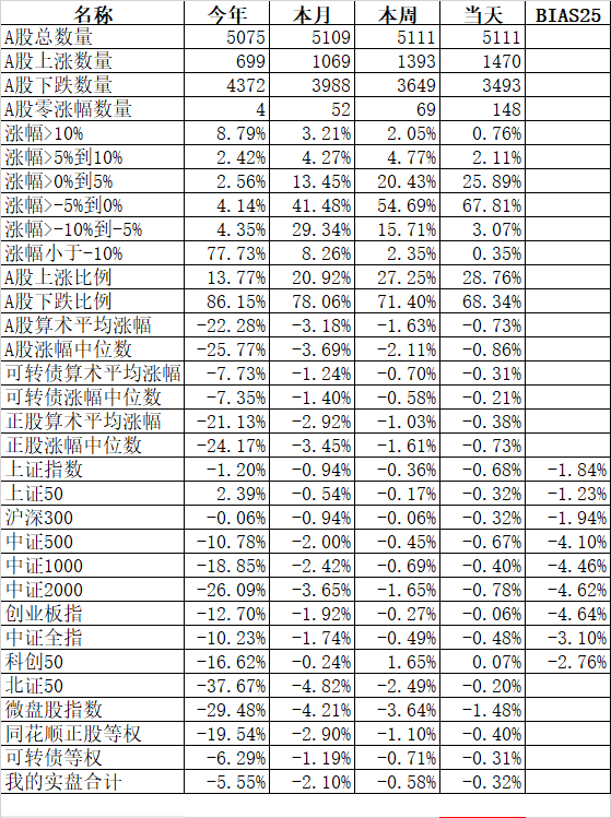 530只可转债平均上涨0.29%,对应的正股平均下跌0.22%;我的主仓20只可转债平均下跌0.17%,对应正股平均上涨0.17%。账户合计实际下跌0.24%。