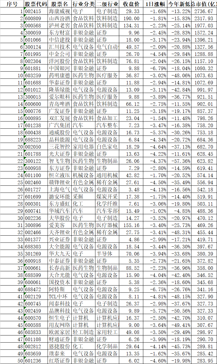 今天同时又有泸州老窖、金龙鱼、中信建投、中金公司、汇川技术、中国中免、华泰证券、药明康德、隆基绿能、爱尔眼科、广发证券、联影医疗、传音控股、通威股份、三花智控、东方证券、恒力液压、同仁堂、东方盛虹、兴业证券等293只个股盘中创出今年新低。市场两级分化很严重。