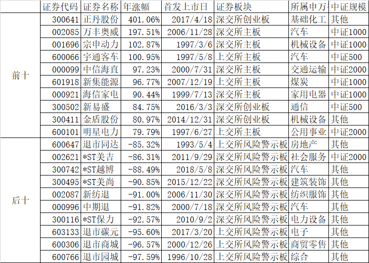 最后我们来看一下今年上半年涨幅前10和后10的个股: