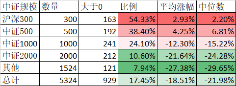 这个就很明显的体现出今年上半年的规律了:就是大强小弱。中证1000数量没满1000只,中证2000数量没满2000只,是因为年中调整加入了2024年的新股,这里的统计剔除了新股。