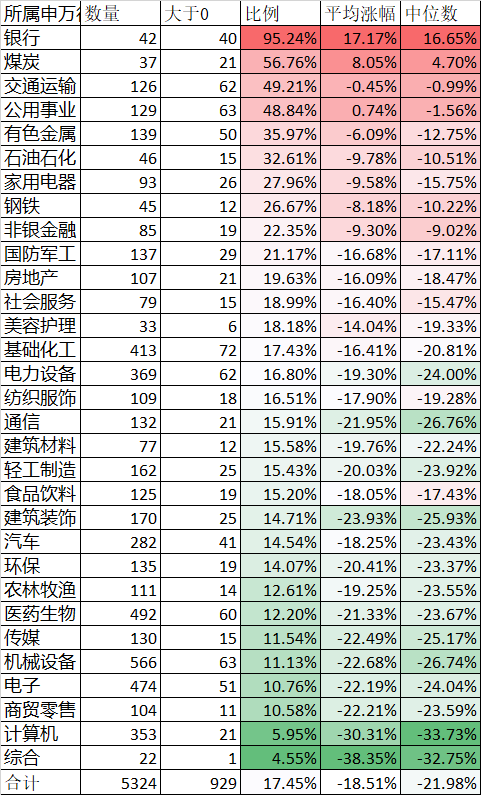 所以申万一级31个行业,今年上半年真正全面上涨的行业只有银行。