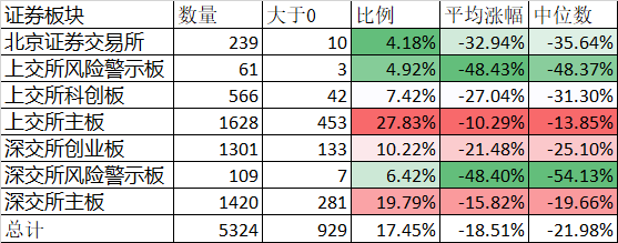 整个市场5319只A股,今年上半年上涨的只有793只,胜率是14.91%,平均下跌了20.56%,中位数下跌了23.73%。其中最好的上交所主板的胜率也只有22.75%,平均下跌了13.80%,中位数下跌了17.31%。