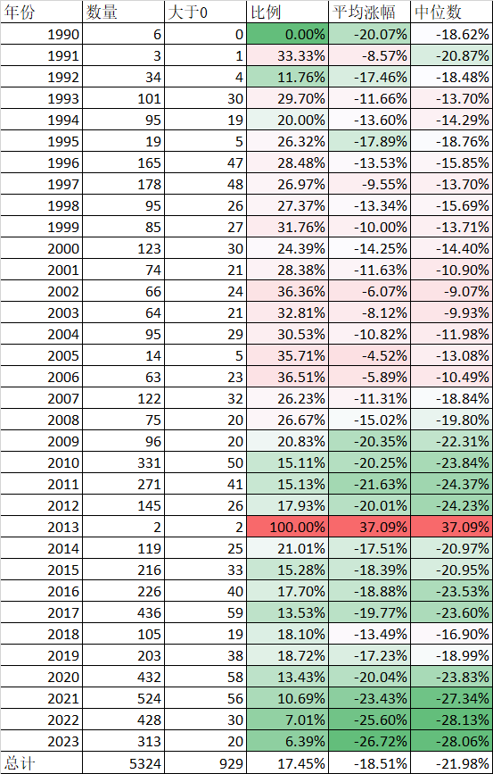 而且我们再仔细分析,发现一个更大的规律,就是从2009年到2023年这15年来,剔除2013年的特殊情况,其他所有的14年,今年上半年的胜率全部不到20%,而再往前推15年,从1994年到2008年上市的,除了1994年和1998年外,其他13年的胜率全部超过了20%。而且上市数量,也就是从2010年以来不断创出新高。
