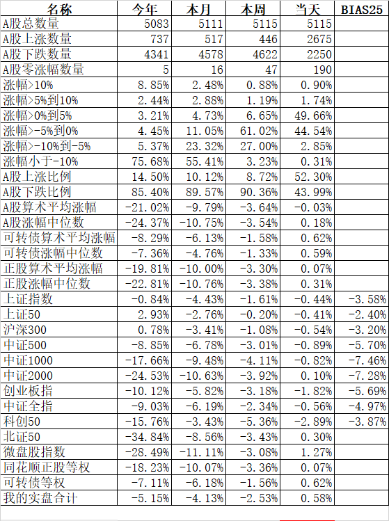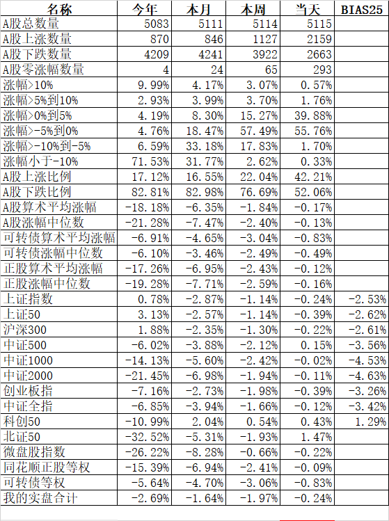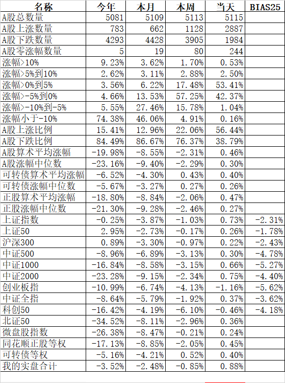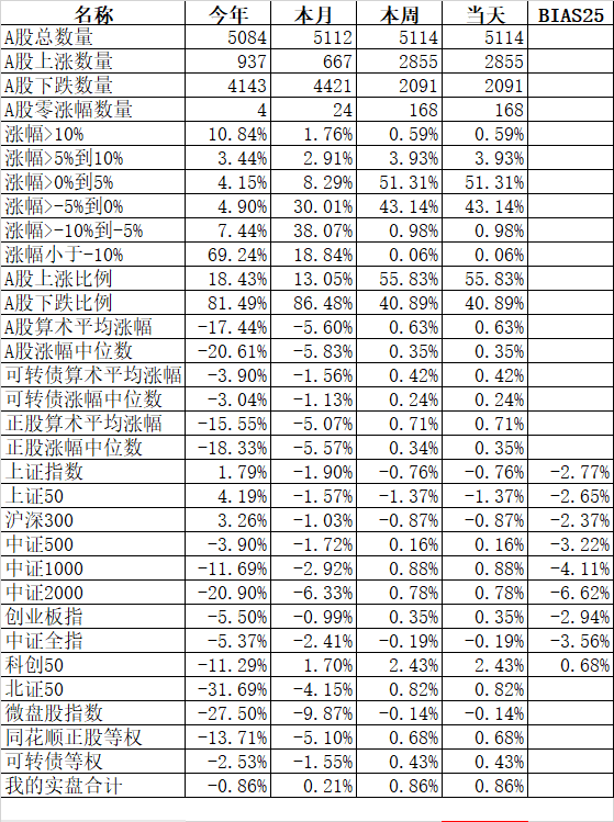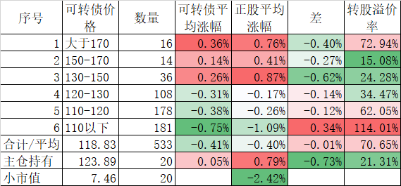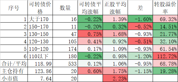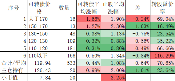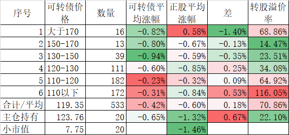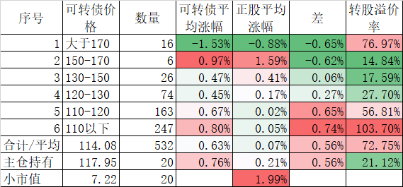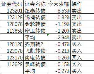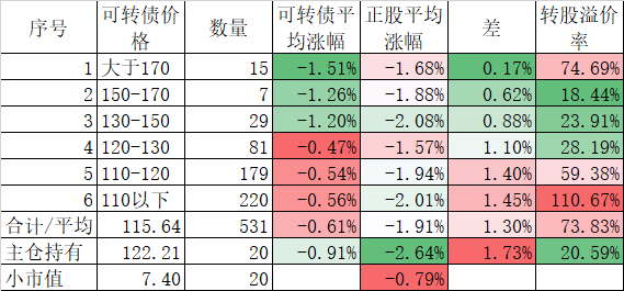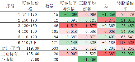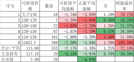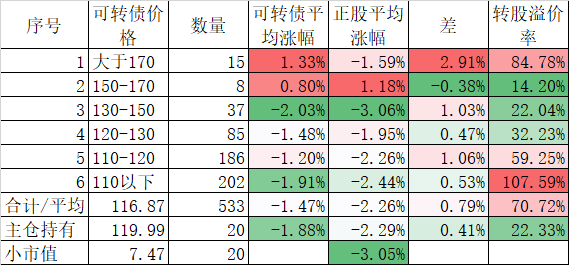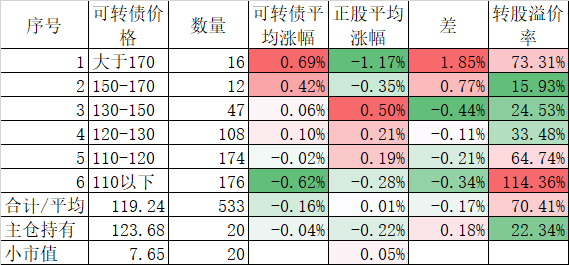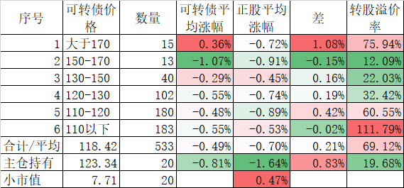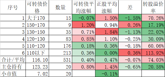 537只可转债平均下跌0.10%,对应正股平均下跌0.88%。我的主仓20只可转债平均上涨0.80%,对应正股平均下跌0.41%。账户实际合计上涨才0.31%。