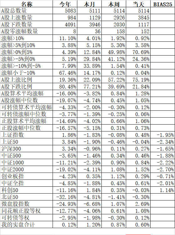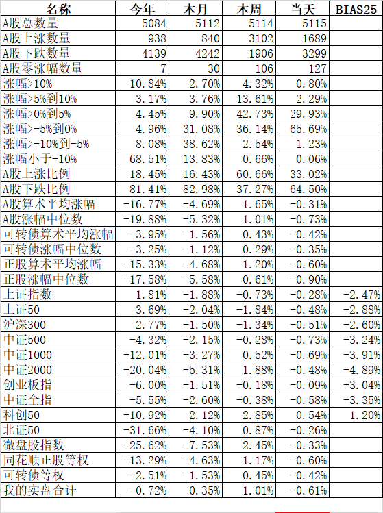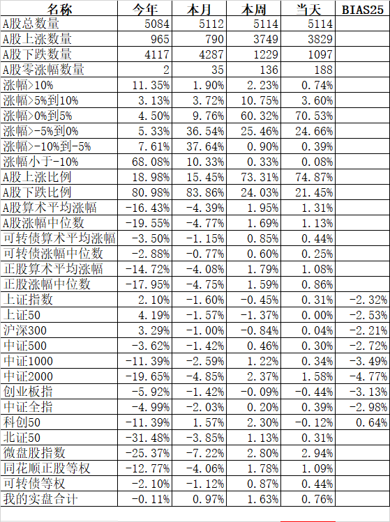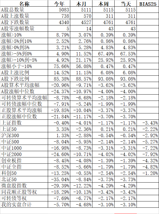 531只可转债平均下跌0.61%,对应正股平均下跌1.91%;我的主仓20只可转债平均下跌0.91%,对应正股平均下跌2.64%。账户合计实际下跌了0.76%。