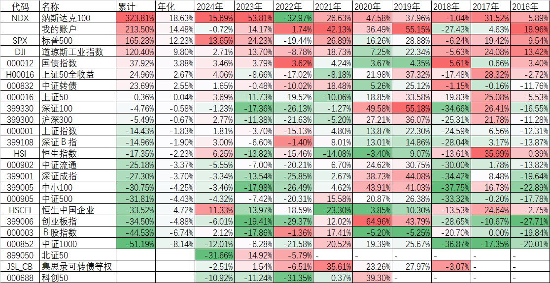 虽然17年来我的总收益率是2742.51%,同期沪深300指数只上涨了68.10%、最好的华夏大盘只涨了995.35%,但如果我们看8年牛市,我只上涨了1574.77%,同期沪深300指数上涨了1767.73%,最好的华夏大盘在这8年牛市里足足上涨了2761.08%,比我17年的收益率都高。