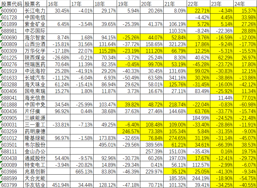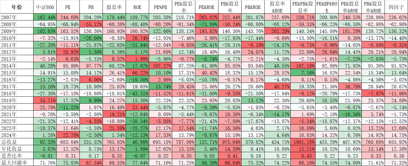 我们再看看表现最好的因子:股东数/少,17年多来年化高达13.08%,但主要是前些年份表现好,特别是2015年个股群魔乱舞,这个因子的收益率高达150.60%。但2024年也亏了16.34%。如果我们不选股东数量最少的20只股票,而选股东数量最多的20只股票,那么17年多的累计收益只有14.75%,年化只有0.79%,不仅跑输沪深300指数,甚至跑输存银行和货币基金。人多的地方确实不能去。