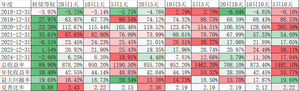今天再次比较了我的可转债策略在持有5-20只,轮动1-10天,5%止盈,佣金及滑点双边千三,截止到昨天的回测情况: