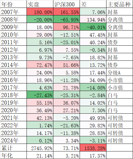 今年主要靠可转债轮动,最终取得了14.17%的收益率。从我2007年开始入市以来,17年来取得了2742.51%的收益率,年化高达21.76%。远远跑赢了同期的沪深300指数和最好的公募基金华夏大盘。但如果我们按照当年沪深300指数上涨算牛市,下跌算熊市,17年来正好是8年牛市9年熊市,分开来统计结果如下: