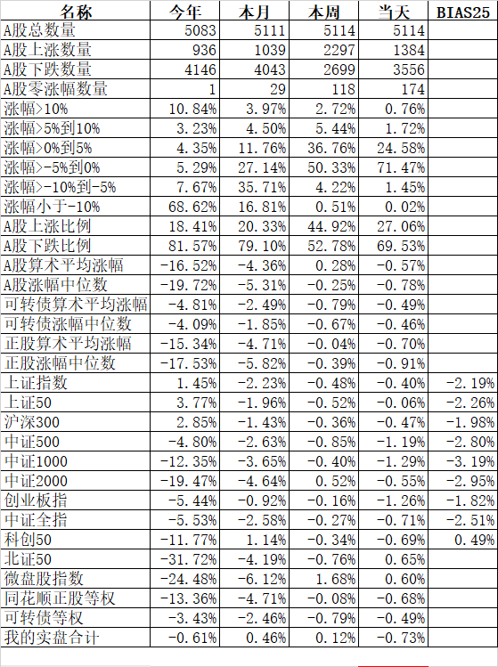 504只个股上涨、4516只个股下跌,涨幅中位数-1.97%。昨天上涨的今天基本上又跌回去了,特别是大市值的指数和个股。