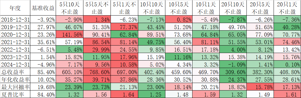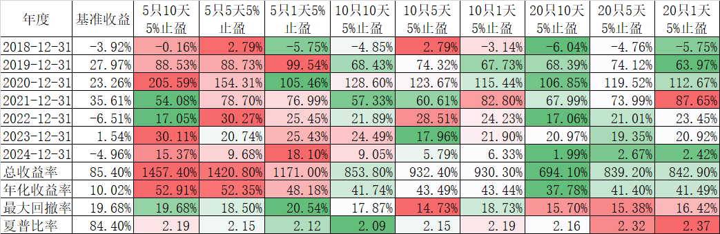 这个回测理论最佳策略是每天轮动5%止盈,2018年起年化达到惊人的82.61%,即使2024年都可以到49.67%,不过最大回撤也是惊人的28.39%。这个回测说明了:轮动越快、数量越少、越止盈,效果越好。但轮动快了对大资金有很大的冲击成本,而且加大操作频次;数量少了增加了波动,增加了止盈一样增加了不确定性。所以没有最佳策略,只有最适合自己的策略。